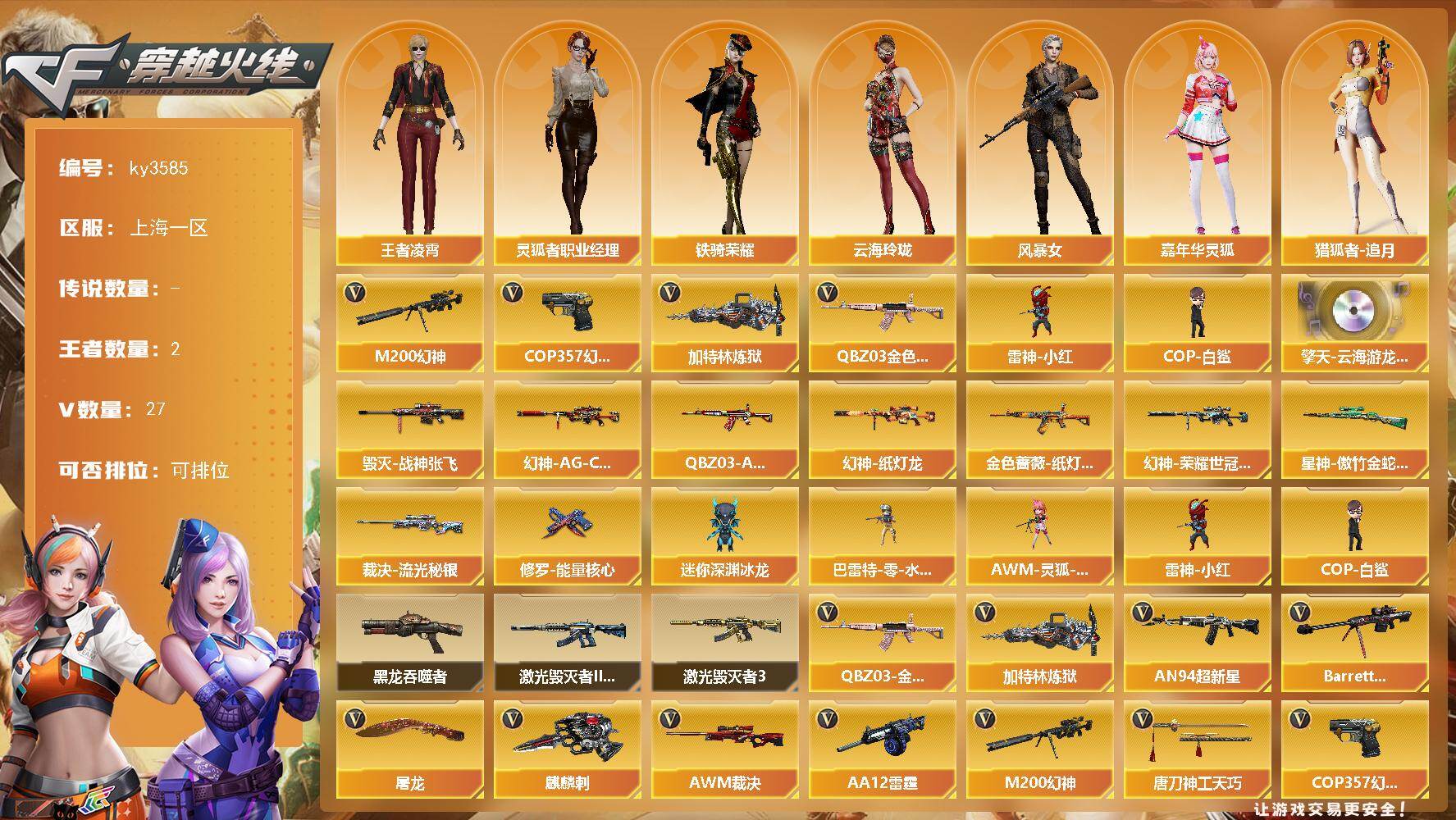 [16239399]上海一区-27V-2王者-0炫金 【热门武器】:QBZ03-金色蔷薇,M200-幻神,加特林-炼狱,雷神-小红,COP-白鲨,COP 357-幻灵 【音效卡】:擎天-云海游龙音效卡 【皮肤】:幻神-AG-CFPLS17冠军,幻神-纸灯龙皮肤,幻神-荣耀世冠白鲨2023 皮肤,QBZ03-AG-CFPLS19冠军,金色蔷薇-纸灯龙皮肤,裁决-流光秘银,星神-傲竹金蛇 皮肤,毁灭-战神张飞,修罗-能量核心*3 【角色】:王者凌霄,云海玲珑,风暴女,嘉年华灵狐,猎狐者-追月,灵狐者-七夕宝贝,灵狐者-职业经理,潘多拉-X,铁骑荣耀 【人偶武器】:雷神-小红,COP-白鲨,巴雷特-零-水下丽影,AWM-灵狐-15周年嘉年华,迷你深渊冰龙 【暴走生化】:黑龙吞噬者 【挑战大师】:激光毁灭者III-白马银枪,激光毁灭者III 【英雄级武器】:AN94-超新星,无影-神兵利器,QBZ03-金色蔷薇,王者白虎-觉醒版,Barrett-毁灭,AWM-裁决,M200-幻神,加特林-炼狱,AA-12-雷霆,COP 357-幻灵,屠龙,麒麟刺,幻灵之锋,唐刀-神工天巧,高爆手雷-幻灵*2,高爆手雷-神工天巧,闪光弹-幻灵*3,闪光弹-神工天巧,烟雾弹-幻灵*4,烟雾弹-神工天巧*2,M4A1-赤狱骑士 【道具】:全能枪王背包,女皇终结者-魔龙之吻,救世主-黑桃战神,夺命之镰,防化服,金色流光-枪王排位*2,星辰流光-枪王排位,枪王排位29赛季金色流光,动感闪耀表情,防弹头盔*2,防弹衣*2,C4工具钳*2,手雷包*2 【特殊枪械】:1炼狱