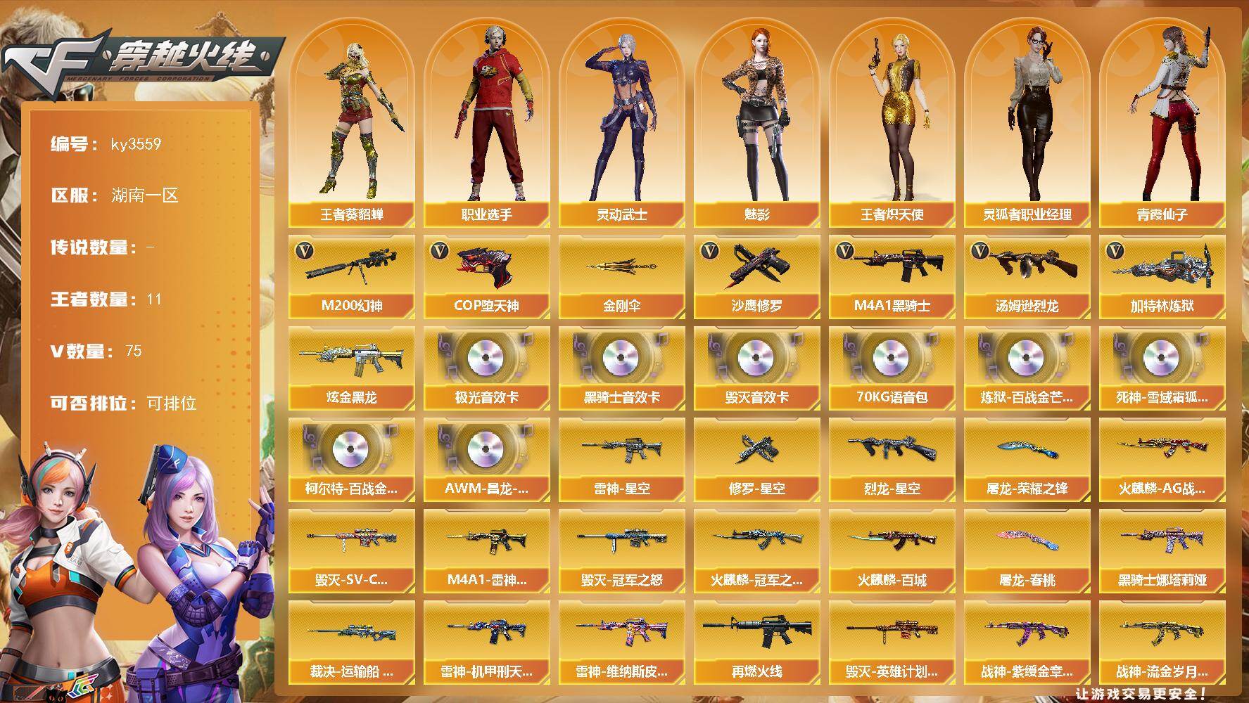 [16238847]湖南一区-75V-11王者-1炫金 【热门武器】:M200-幻神,M4A1-黑骑士,汤姆逊-烈龙*2,加特林-炼狱,COP-堕天神,沙鹰-修罗*3,金刚伞 【王者炫金武器】:炫金黑龙 【音效卡】:M4A1-黑骑士音效卡,Barrett-毁灭音效卡,Barrett-极光音效卡,70KG语音包,炼狱-百战金芒-庆典舞曲音效卡,死神-雪域霜狐-怀旧音效卡,柯尔特-百战金芒-庆典舞曲音效卡,AWM-昌龙-怀旧音效卡 【皮肤】:裁决-运输船 皮肤,烈龙-星空,雷神-星空,M4A1-雷神-CFS 2019,雷神-机甲刑天皮肤,雷神-维纳斯皮肤,M4A1-再燃火线,火麒麟-AG战队皮肤,火麒麟-冠军之心,火麒麟-百城,毁灭-冠军之怒,毁灭-SV-CFPLS16冠军,毁灭-英雄计划 皮肤,M4A1-黑骑士-娜塔莉娅 皮肤,战神-紫绶金章皮肤,战神-流金岁月皮肤,AK47-B-常胜将军-曹操*2,AK47-B-常胜将军-刘备,AK47-B-常胜将军-孙权,修罗-星空,屠龙-荣耀之锋,屠龙-春桃 皮肤,轻型军用手斧-再燃火线 【角色】:魅影,战地猎狐,王者-葵-貂蝉,王者炽天使,雪域霜狐,奇洋探员,乔伊教练,云海玲珑,初恋灵狐,芳心审判者,飞虎队-X,风暴女,嘉年华灵狐,娟娟,兰-海滩派对,猎狐者-追月,灵动武士,灵狐者-黄金海岸,灵狐者-七夕宝贝,灵狐者-职业经理,龙儿,麻雀,潘多拉-X,青霞仙子,铁扇公主-暗灵,雪莉杨,游珑儿,职业选手 【人偶武器】:天龙-曼陀罗,火麒麟-灵狐,M4A1-雷神-精英刀锋,巴雷特-零-水下丽影,AWM-灵狐-15周年嘉年华,M37-葵,迷你深渊冰龙,迷你裂空之翼,迷你波特博士,夺魂,迷你牛牛*2,生化手雷-机甲核心*3,闪光弹-小乔,闪光弹-貂蝉,高爆手雷-大乔,迷你艾比,迷你超能女侍,灵狐娃娃手雷*2 【挑战大师】:AK47-冰龙粉碎者,VEPR-12-金魔,机甲撕裂者III,试炼破坏者III,KAC-圣炎切割者III,神圣爆裂者-末日III 【英雄级武器】:AK47-火麒麟,M4A1-黑龙,M4A1-雷神*2,M4A1-黑骑士,AK47-无影,M4A1-死神,AK47-黑武士,AK47-黑鲨,M4A1-龙血,M4A1-堕天神,无影-神兵利器,死神-雪域霜狐,M4A1-猎神,烈火-动感闪耀,王者之幻-觉醒版,AK-47-猩红传说,AK47-B-战