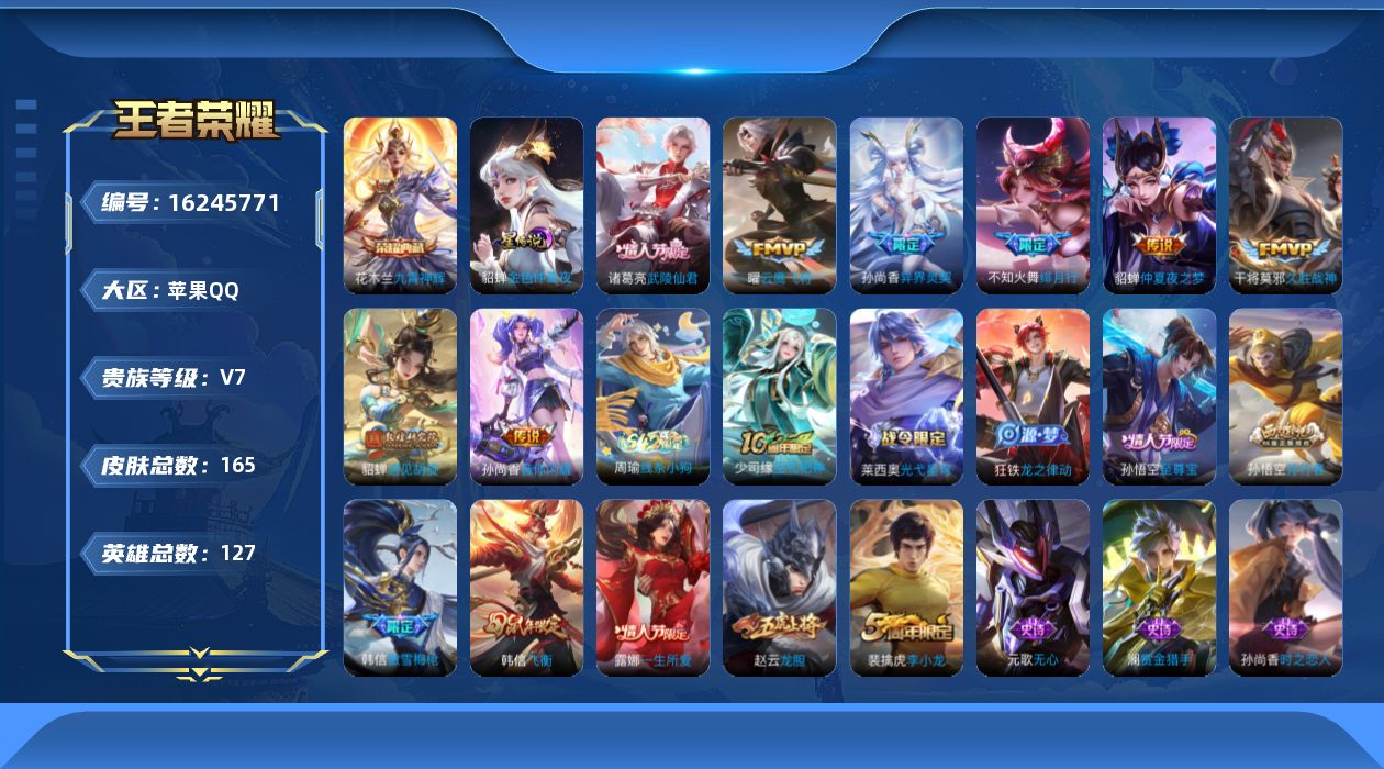 - [11880048]V7 7传说 122英雄 172皮肤 可修改实名 优质装备:云鹰飞将(小将军),绛天战甲(鸡嘴战神),地狱火,山海·炽霜斩(李信年限),琥珀纪元铠,涂山容容 珍宝阁皮:胡桃夹子,蔷薇恋人 限定皮:至尊宝,齐天大圣,五谷丰年,梁祝,李小龙,寅虎·瑞焰(虎皮蛋子),神器·万象笔 史诗皮:石田雨龙,茶境仙,上官婉儿群星魔术团,百相守梦-百里守约,百相守梦-黄忠,紫霞仙子,黄金分割率,千年之狐,江河有灵,高渐离燃音魔法,偶像歌手,猫狗日记-孙策,节奏热浪,修罗,女仆咖啡,摇滚巨星,水果甜心,天才门将,星夜王子,德古拉伯爵,暗隐猎兽者,幽灵船长,鬼剑武藏,乐园奇幻夜,天秀·启明,地狱岩魂,纤云弄巧,水晶猎龙者,热力回旋,金属风暴,圣诞狂欢,鹰眼统帅,魅力维加斯,无心,未来纪元-赵云