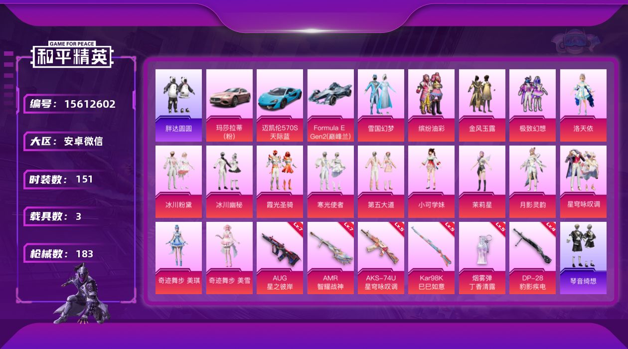 [15612602]雪国猪妹洛天依暗影哥特 2把7级枪 安卓 微信-16粉装-6特效枪-3载具-3粉色飞行器-67581热力值-12王牌印记-151套装-183枪皮
