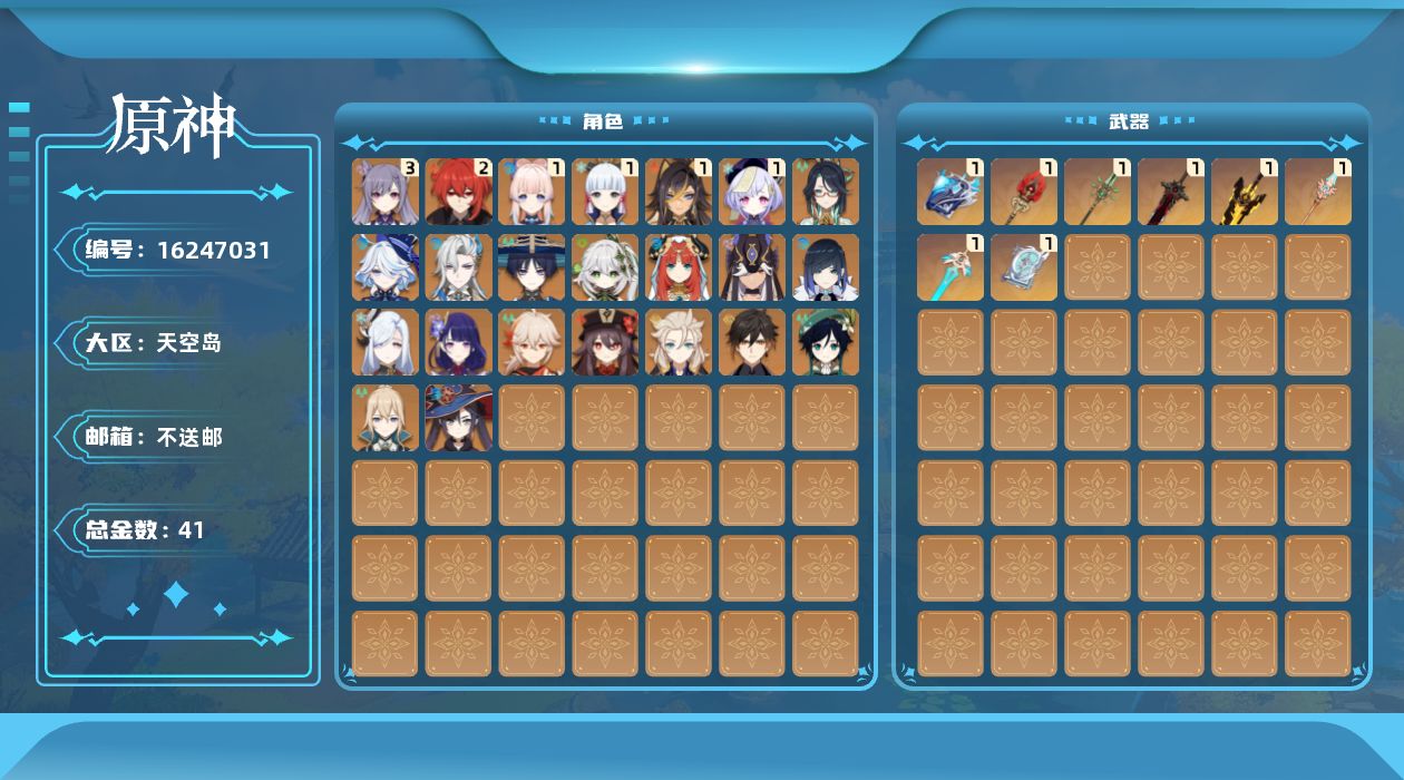 0命闲云,0命芙宁娜,0命那维莱特,1命迪希雅,0命流浪者,0命纳西妲,0命妮露,0命赛诺,0命夜兰,0命申鹤,0命雷电将军,0命枫原万叶,1命神里绫华,0命钟离,0命胡桃,0命温迪,0命阿贝多,1命珊瑚宫心海,3命刻晴,1命七七,0命琴,0命莫娜,2命迪卢克,精1万世流涌大典,精1无工之剑,精1护摩之杖,精1四风原典,精1和璞鸢,精1天空之脊,精1天空之刃,精1狼的末路