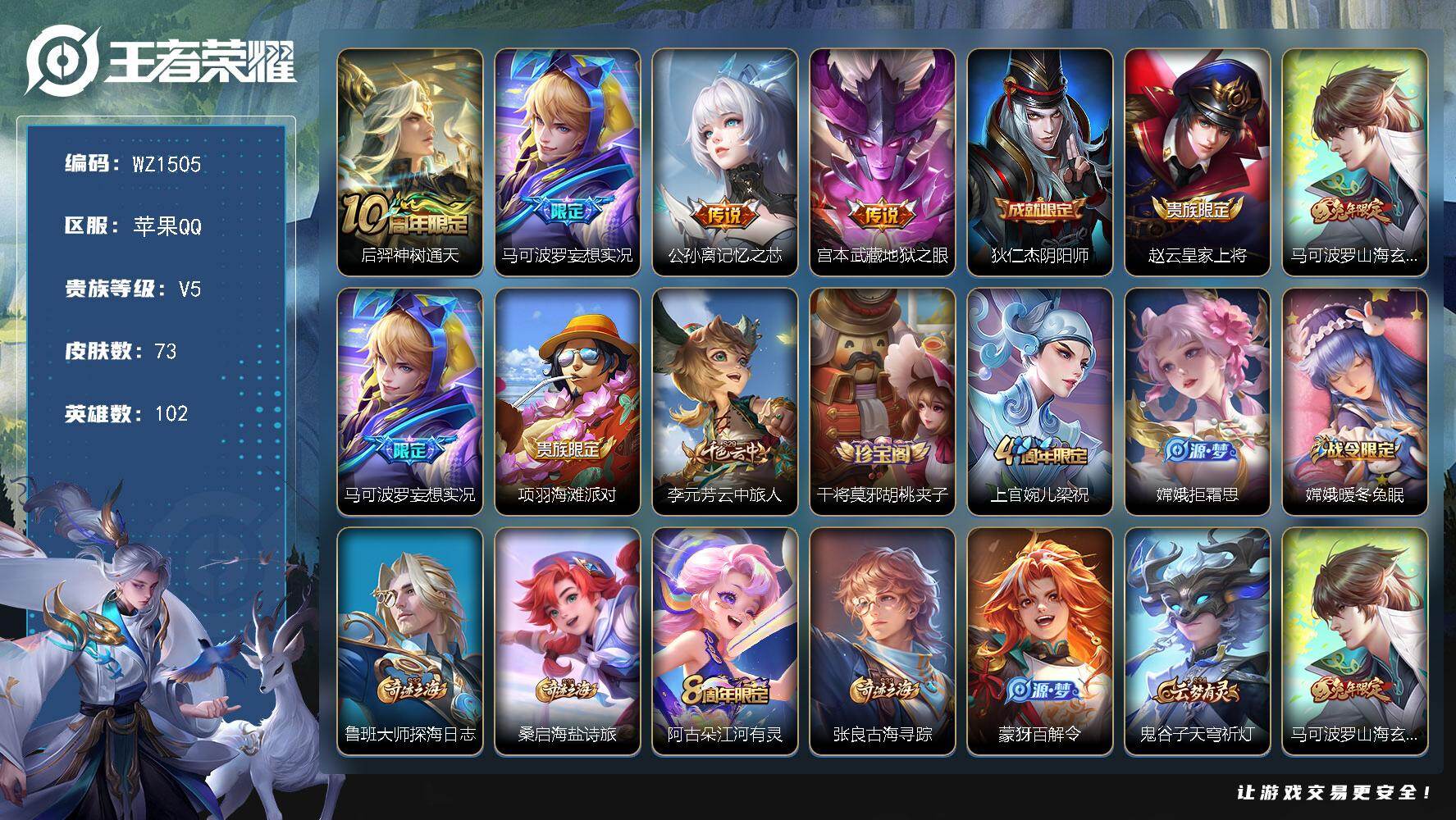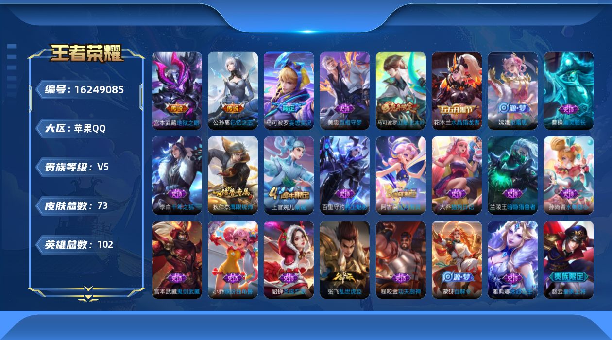 [16249085]苹果Q-73皮肤-4传说-23史诗 【传说皮肤】:后羿神树通天,马可波罗妄想实况,公孙离记忆之芯,宫本武藏地狱之眼 【限定皮肤】:狄仁杰阴阳师,赵云皇家上将,马可波罗山海玄木吟,马可波罗妄想实况,项羽海滩派对,李元芳云中旅人,干将莫邪胡桃夹子,上官婉儿梁祝,嫦娥拒霜思,嫦娥暖冬兔眠,鲁班大师探海日志,桑启海盐诗旅,阿古朵江河有灵,张良古海寻踪,蒙犽百解令,鬼谷子天穹祈灯 【年限皮肤】:马可波罗山海玄木吟 【赛季限定】:李元芳云中旅人,桑启海盐诗旅,鲁班大师探海日志,张良古海寻踪,鬼谷子天穹祈灯,太乙真人谧流熔炉,钟馗虚灵犬护 【战令限定】:嫦娥暖冬兔眠 【史诗皮肤】:赵云皇家上将,貂蝉圣诞恋歌,宫本武藏鬼剑武藏,孙尚香水果甜心,嬴政摇滚巨星,刘禅绅士熊喵,曹操幽灵船长,李白千年之狐,张飞乱世虎臣,花木兰水晶猎龙者,小乔缤纷独角兽,兰陵王暗隐猎兽者,雅典娜冰冠公主,百里守约特工魅影,程咬金功夫厨神,大乔猫狗日记,狄仁杰鹰眼统帅,上官婉儿梁祝,嫦娥拒霜思,马可波罗山海玄木吟,阿古朵江河有灵,蒙犽百解令,黄忠百相守梦 【其他皮肤】:项羽海滩派对,韩信街头霸王,露娜哥特玫瑰,阿轲爱心护理,赵云白执事,赵云忍炎影,安琪拉玩偶对对碰,亚瑟死亡骑士,达摩拳王,花木兰兔女郎,张飞五福同心,狄仁杰阴阳师,李白敏锐之力,吕布野性能量,干将莫邪胡桃夹子,蒙恬蔚蓝守将,李元芳云中旅人,桑启海盐诗旅,嫦娥暖冬兔眠,牛魔牛运亨通,鲁班大师探海日志,李元芳妄想特派,张良古海寻踪,后羿完美运算,鬼谷子天穹祈灯,海诺时空谍影,太乙真人谧流熔炉,明世隐景韶洛都,钟馗虚灵犬护,阿古朵布丁狗之约,白起死霸装,莱西奥踏浪烽翎,艾琳鹤鸣心笺,王昭君精灵公主,狄仁杰锦衣卫,孙悟空西部大镖客,铠龙域领主,公孙离花间舞,孙策海之征途,伽罗花见巫女,上官婉儿修竹墨客,曜归虚梦演,西施归虚梦演,司空震启蛰,云缨赤焰之缨,暃碧珀绯影 【内测皮肤】:干将莫邪胡桃夹子 【营地ID】:1782641170