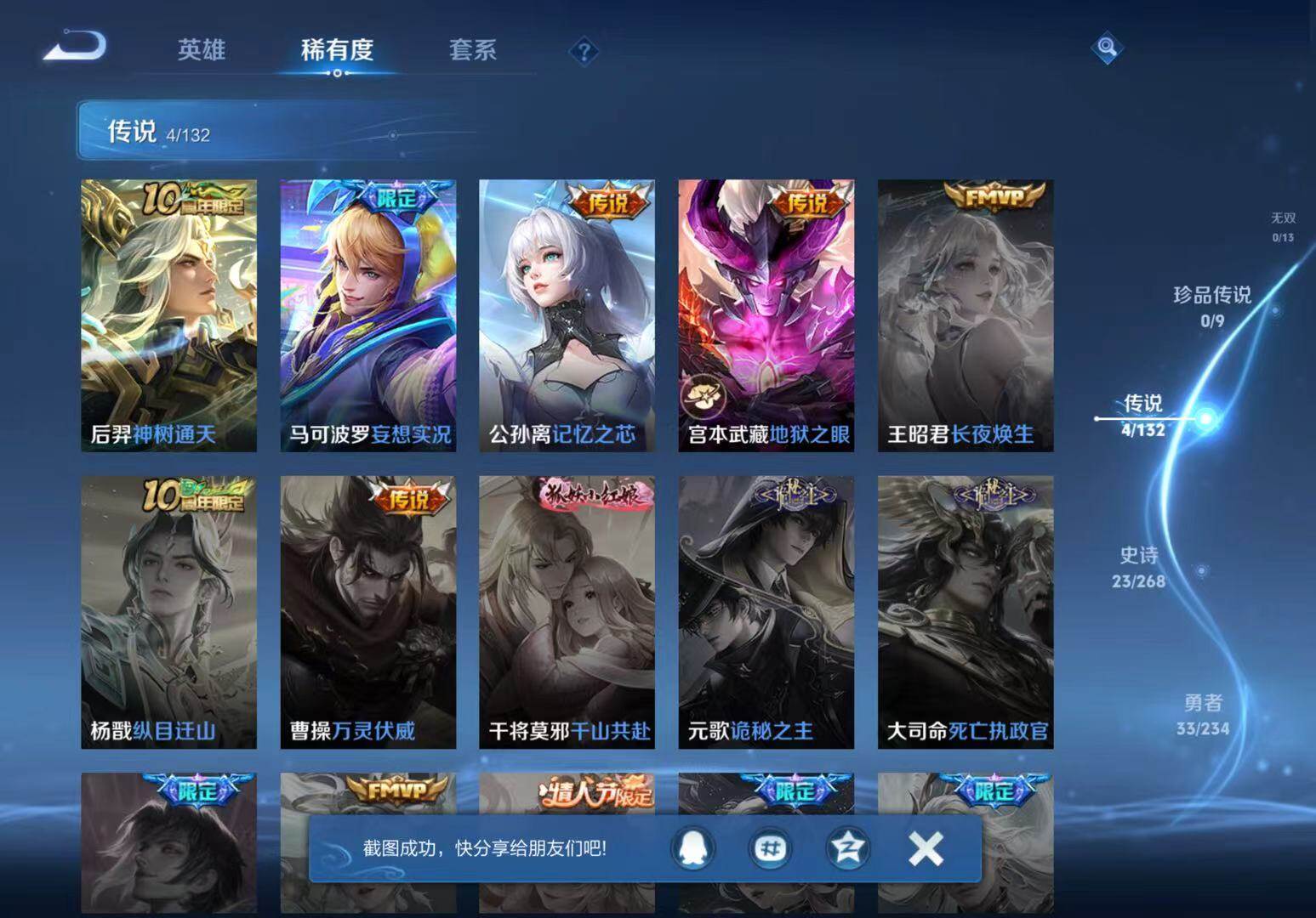 【史诗皮肤】:赵云皇家上将,貂蝉圣诞恋歌,宫本武藏鬼剑武藏,孙尚香水果甜心,嬴政摇滚巨星,刘禅绅士熊喵,曹操幽灵船长,李白千年之狐,张飞乱世虎臣,花木兰水晶猎龙者,小乔缤纷独角兽,兰陵王暗隐猎兽者,雅典娜冰冠公主,百里守约特工魅影,程咬金功夫厨神,大乔猫狗日记,狄仁杰鹰眼统帅,上官婉儿梁祝,嫦娥拒霜思,马可波罗山海玄木吟,阿古朵江河有灵,蒙犽百解令,黄忠百相守梦