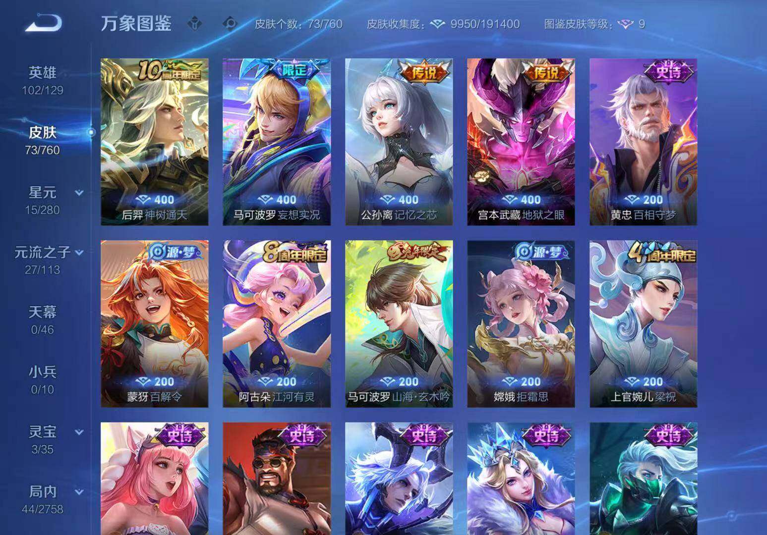 【限定皮肤】:狄仁杰阴阳师,赵云皇家上将,马可波罗山海玄木吟,马可波罗妄想实况,项羽海滩派对,李元芳云中旅人,干将莫邪胡桃夹子,上官婉儿梁祝,嫦娥拒霜思,嫦娥暖冬兔眠,鲁班大师探海日志,桑启海盐诗旅,阿古朵江河有灵,张良古海寻踪,蒙犽百解令,鬼谷子天穹祈灯