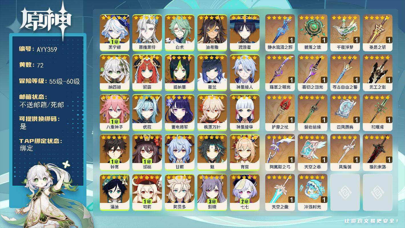 [16249434]60级/72黄/男主/30个五星角色/24个五星武器 1命芙宁娜,0命那维莱特,0命白术,0命迪希雅,0命流浪者,0命纳西妲,0命妮露,0命提纳里,0命夜兰,0命神里绫人,1命八重神子,0命优菈,0命雷电将军,0命枫原万叶,0命神里绫华,1命钟离,1命胡桃,0命甘雨,0命魈,0命宵宫,0命温迪,1命可莉,0命阿贝多,3命刻晴,2命七七,1命琴,5命莫娜,2命迪卢克,0命玛拉妮,0命玛薇卡,精1静水流涌之辉,精1碧落之珑,精1千夜浮梦,精1圣显之钥,精1薙草之稻光,精1雾切之回光,精1苍古自由之誓,精1无工之剑,精1护摩之杖,精1磐岩结绿,精1四风原典,精1和璞鸢,精1阿莫斯之弓,精1天空之卷,精1风鹰剑,精1狼的末路,精1天空之傲,精1冲浪时光