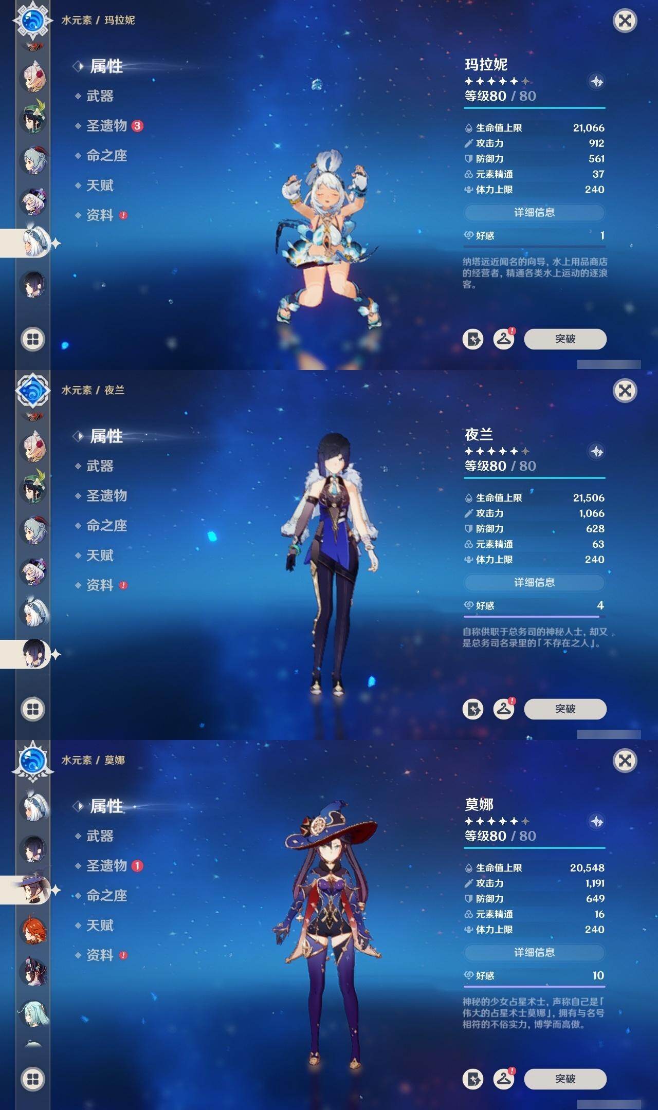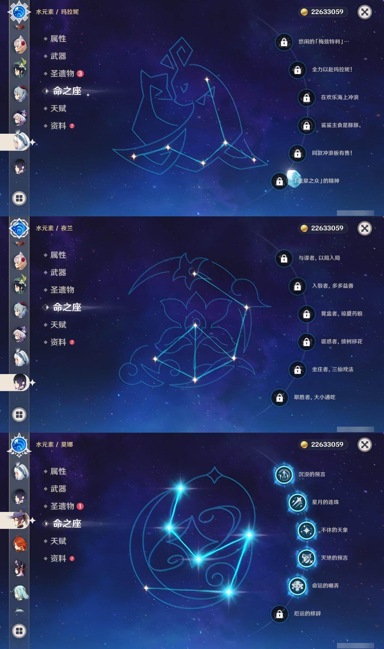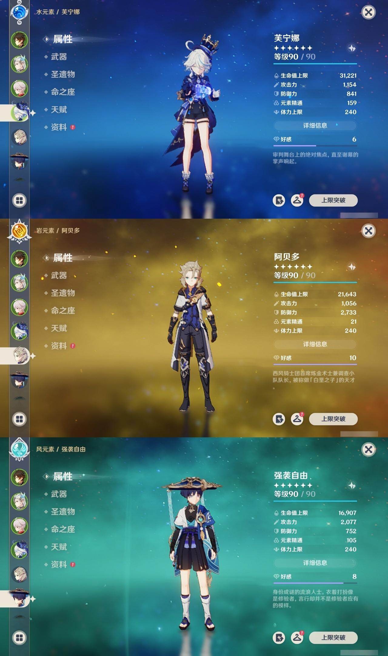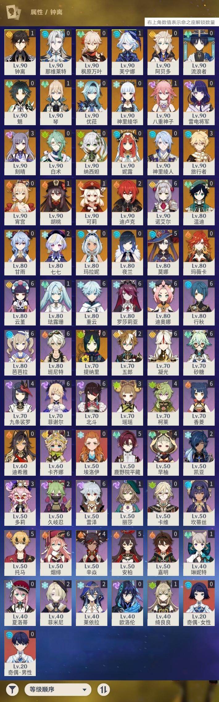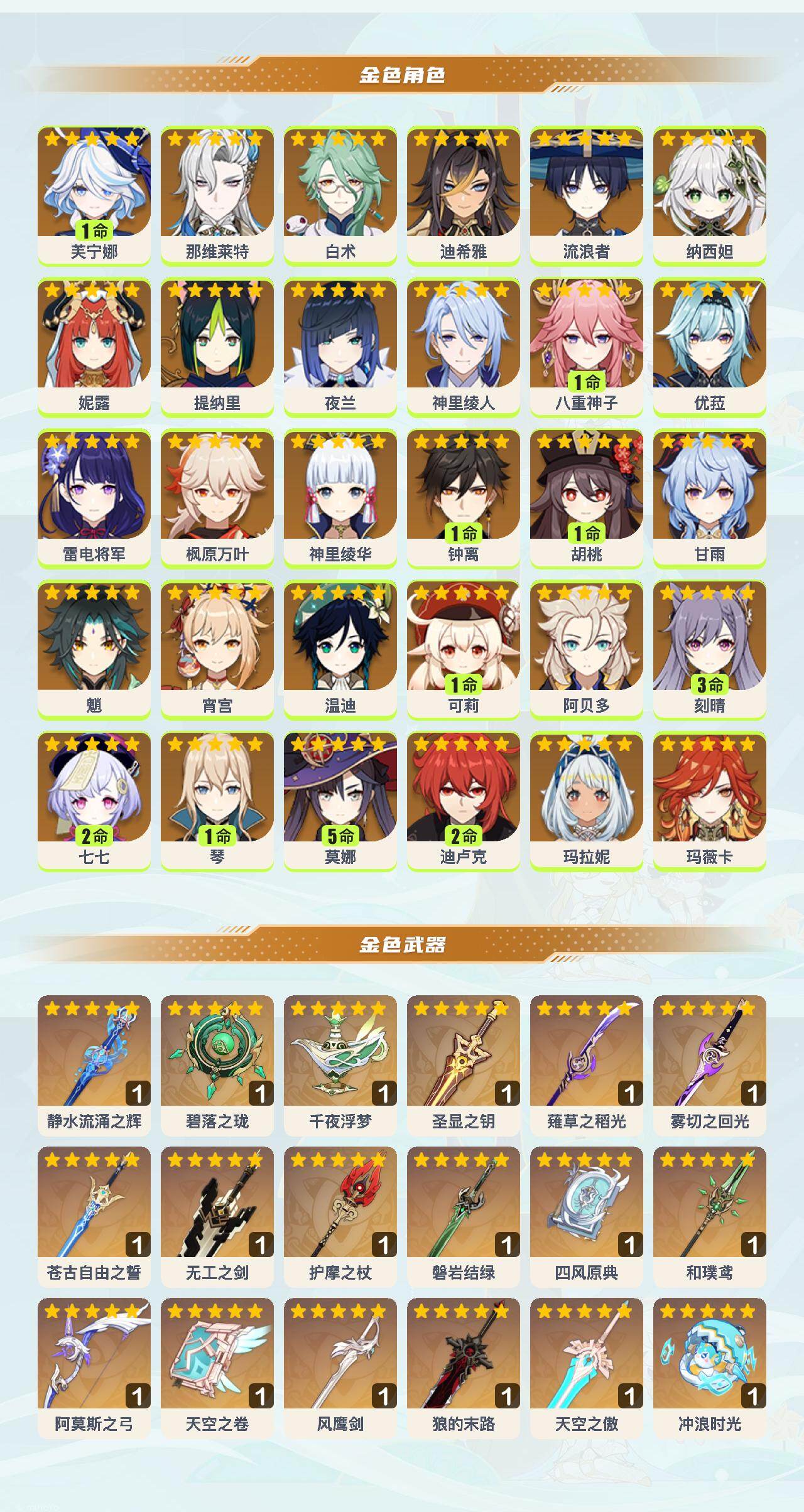 1命芙宁娜,0命那维莱特,0命白术,0命迪希雅,0命流浪者,0命纳西妲,0命妮露,0命提纳里,0命夜兰,0命神里绫人,1命八重神子,0命优菈,0命雷电将军,0命枫原万叶,0命神里绫华,1命钟离,1命胡桃,0命甘雨,0命魈,0命宵宫,0命温迪,1命可莉,0命阿贝多,3命刻晴,2命七七,1命琴,5命莫娜,2命迪卢克,0命玛拉妮,0命玛薇卡,精1静水流涌之辉,精1碧落之珑,精1千夜浮梦,精1圣显之钥,精1薙草之稻光,精1雾切之回光,精1苍古自由之誓,精1无工之剑,精1护摩之杖,精1磐岩结绿,精1四风原典,精1和璞鸢,精1阿莫斯之弓,精1天空之卷,精1风鹰剑,精1狼的末路,精1天空之傲,精1冲浪时光