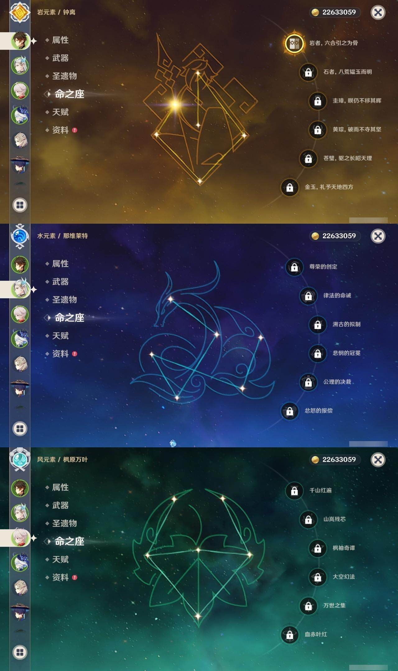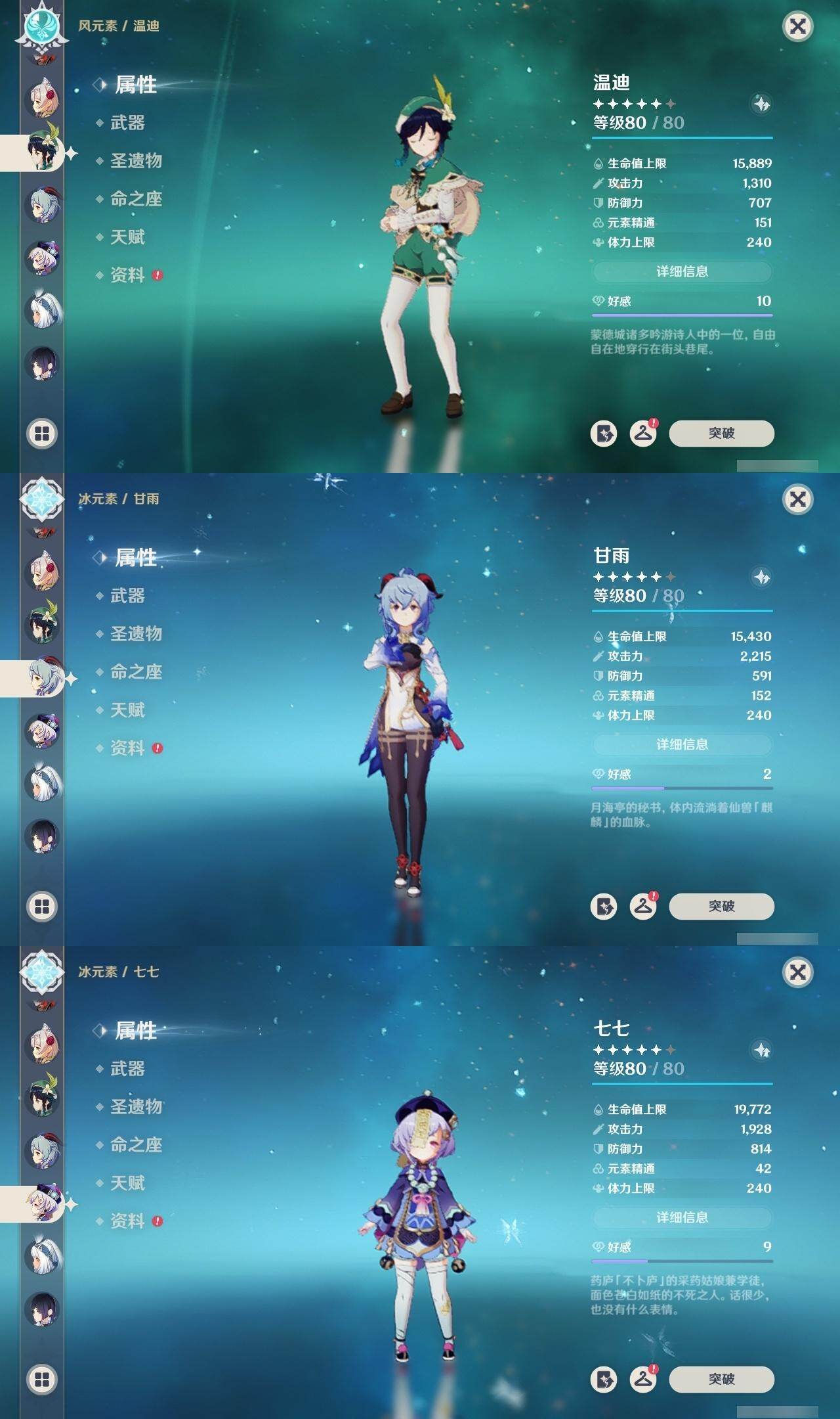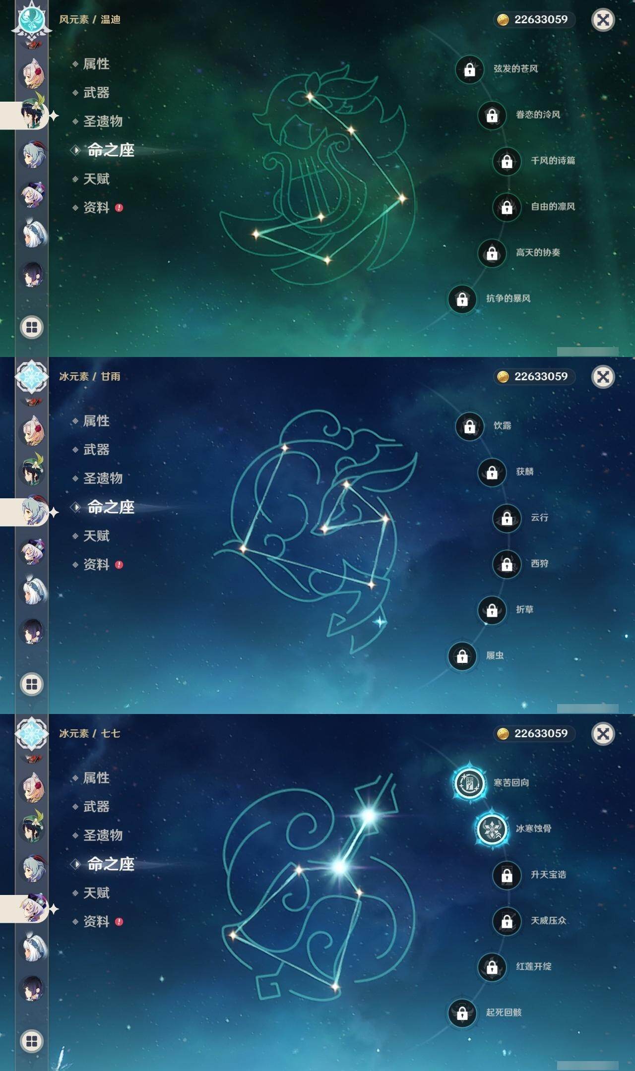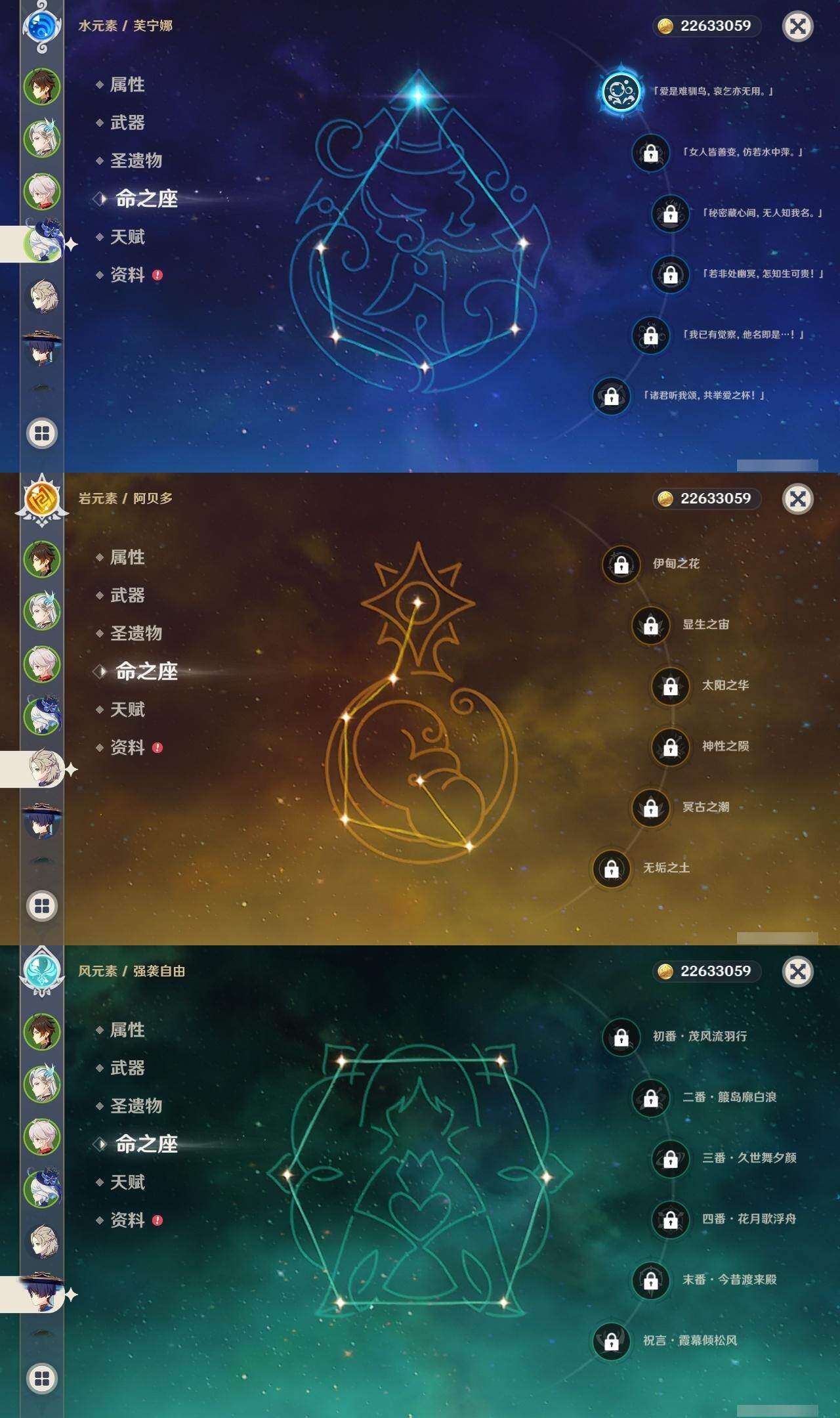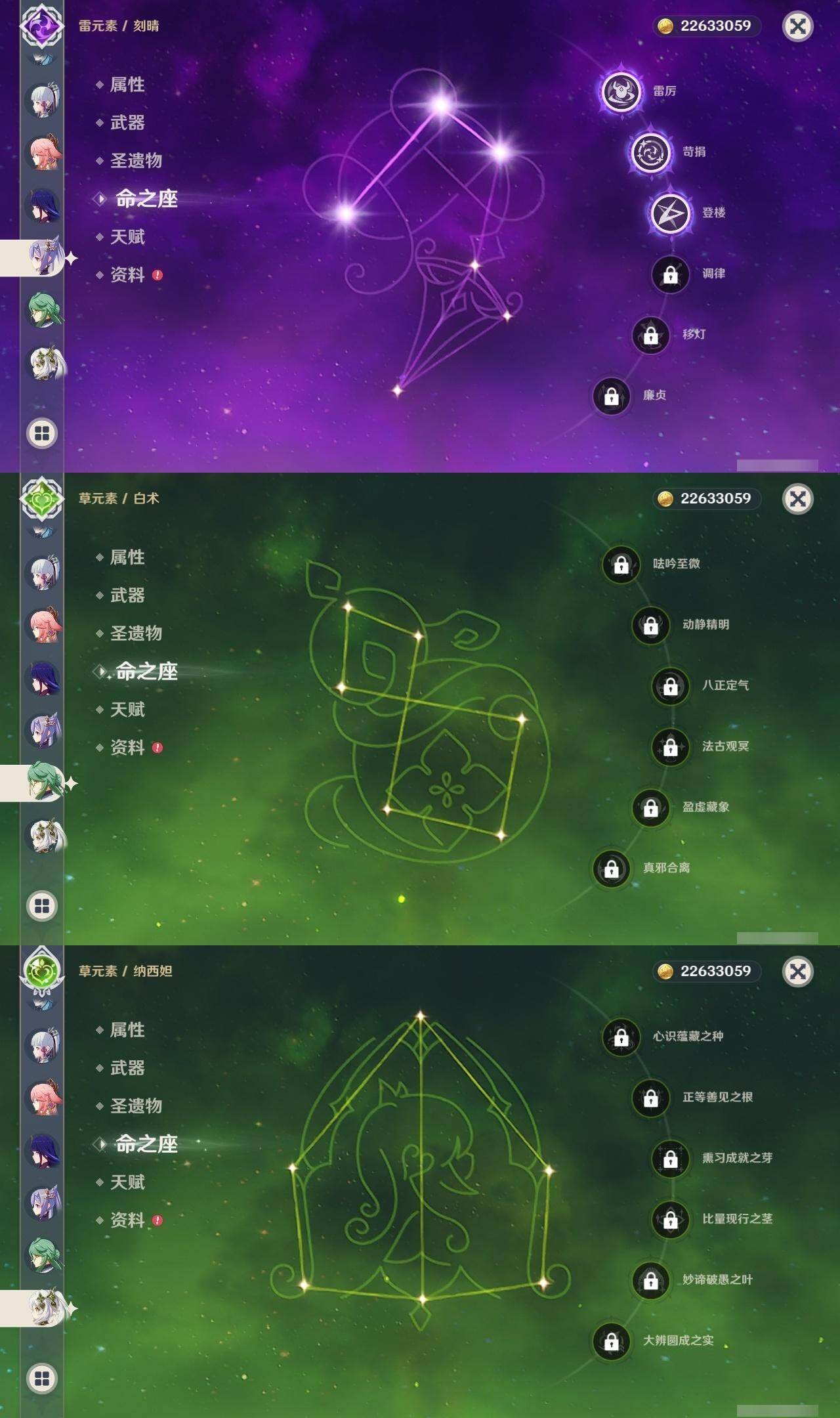 1命芙宁娜,0命那维莱特,0命白术,0命迪希雅,0命流浪者,0命纳西妲,0命妮露,0命提纳里,0命夜兰,0命神里绫人,1命八重神子,0命优菈,0命雷电将军,0命枫原万叶,0命神里绫华,1命钟离,1命胡桃,0命甘雨,0命魈,0命宵宫,0命温迪,1命可莉,0命阿贝多,3命刻晴,2命七七,1命琴,5命莫娜,2命迪卢克,0命玛拉妮,0命玛薇卡,精1静水流涌之辉,精1碧落之珑,精1千夜浮梦,精1圣显之钥,精1薙草之稻光,精1雾切之回光,精1苍古自由之誓,精1无工之剑,精1护摩之杖,精1磐岩结绿,精1四风原典,精1和璞鸢,精1阿莫斯之弓,精1天空之卷,精1风鹰剑,精1狼的末路,精1天空之傲,精1冲浪时光