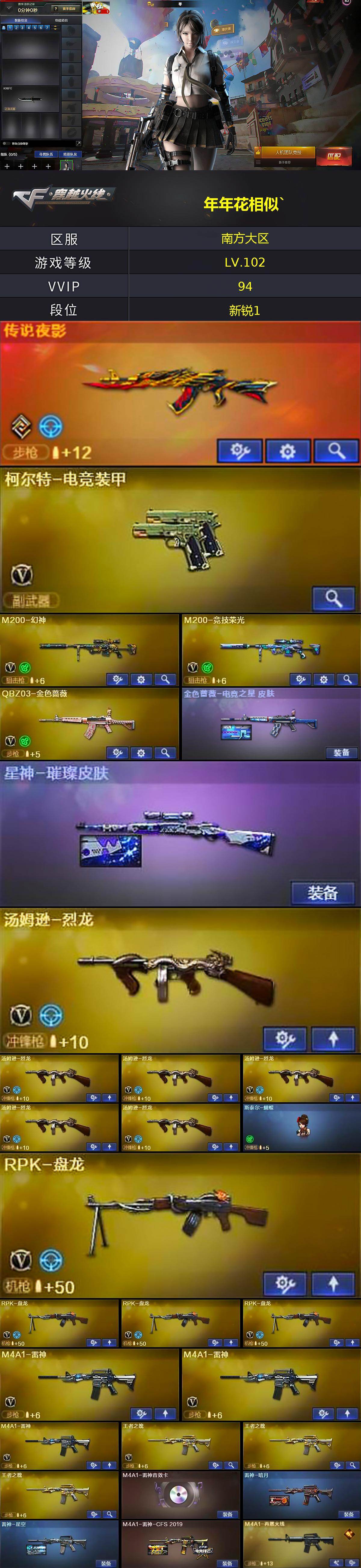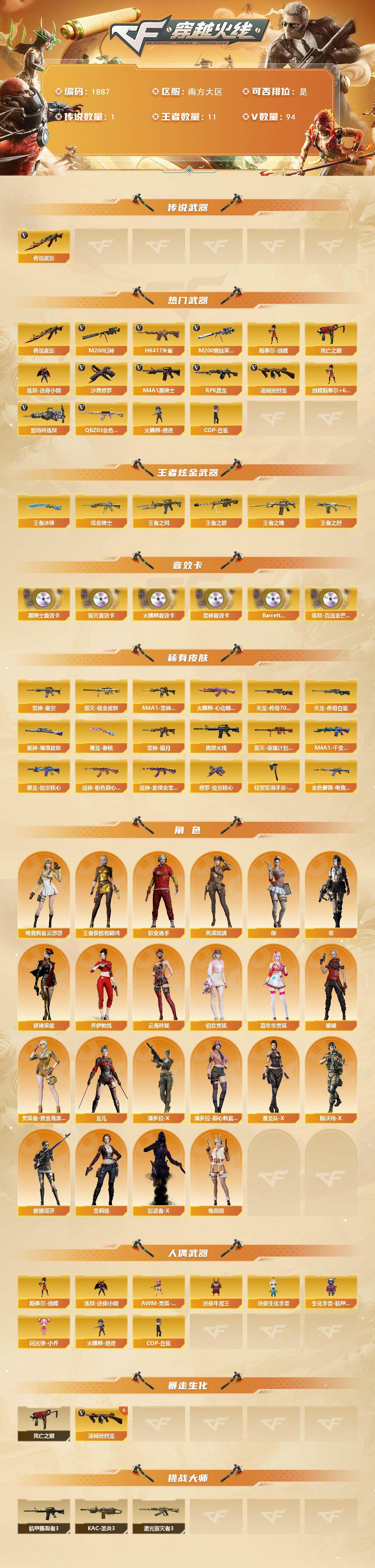 [16249997]南方大区-97V-11王者武器数-1炫金武器数 【传说武器】:传说夜影 【热门武器】:传说夜影,QBZ03-金色蔷薇,HK417-朱雀,M200-幻神,M200-竞技荣光,死亡之眼,炼狱-迷你小钢,M4A1-黑骑士*3,汤姆逊-烈龙*6,RPK-盘龙*4,加特林-炼狱,斯泰尔-蝴蝶,火麒麟-绝迹,COP-白鲨,沙鹰-修罗*2 【王者炫金武器】:王者之戮,王者之魄*2,王者之烈,王者之怒*4,王者冰锋,炫金骑士 【音效卡】:AK47-火麒麟音效卡,M4A1-雷神音效卡,M4A1-黑骑士音效卡,Barrett-毁灭音效卡,Barrett-碧霄极光音效卡,炼狱-百战金芒-庆典舞曲音效卡 【皮肤】:金色蔷薇-电竞之星 皮肤,星神-璀璨皮肤,雷神-暗月,雷神-星空,M4A1-雷神-CFS 2019,M4A1-再燃火线,火麒麟-心动糖果,毁灭耀金皮肤,毁灭-英雄计划 皮肤,M4A1-千变-孔明皮肤,黑龙-能量核心,战神-粉色甜心皮肤*2,战神-紫绶金章皮肤*2,AWM-天龙-传奇70KG,AWM-天龙-传奇白鲨,修罗-能量核心,屠龙-春桃 皮肤*2,轻型军用手斧-再燃火线 【角色】:零,樱,电竞教官-云悠悠,荒漠琉璃,王者葵-惊若翩鸿,乔伊教练,云海玲珑,初恋灵狐,嘉年华灵狐,娟娟,灵狐者-黄金海岸,龙儿,潘多拉-X,潘多拉-甜心教官,潜龙队-X,斯沃特-X,铁骑荣耀,兔囡囡,新娜塔莎,雪莉杨,影武者-X,职业选手 【人偶武器】:火麒麟-绝迹,COP-白鲨,炼狱-迷你小钢,斯泰尔-蝴蝶,AWM-灵狐-15周年嘉年华,迷你牛魔王,迷你生化手雷,生化手雷-机甲核心,闪光弹-小乔 【暴走生化】:死亡之眼 【挑战大师】:激光毁灭者III,机甲撕裂者III,KAC-圣炎切割者III 【英雄级武器】:AK47-火麒麟*2,M4A1-黑龙,M4A1-雷神*3,M4A1-黑骑士*3,AK47-无影,AK47-黑鲨,HK417-朱雀,无影-神兵利器,黑武士-锦绣游龙,M4A1-玫瑰精灵*3,QBZ03-金色蔷薇,王者之魄-觉醒版,AK-47-猩红传说*2,AK47-B-战神,黑骑士-海王,黑武士-CF网剧冠军,AWM-天龙,Barrett-毁灭*3,M200-幻神,M200-竞技荣光,RPK-盘龙*4,加特林-炼狱,炼狱-百战金芒,汤姆逊-烈龙*6,沙鹰-修罗*2,柯尔特-电竞装甲,王者之灵-