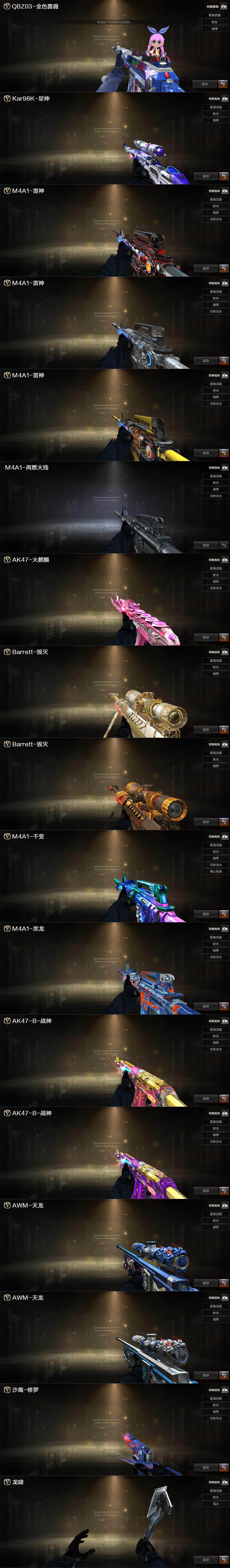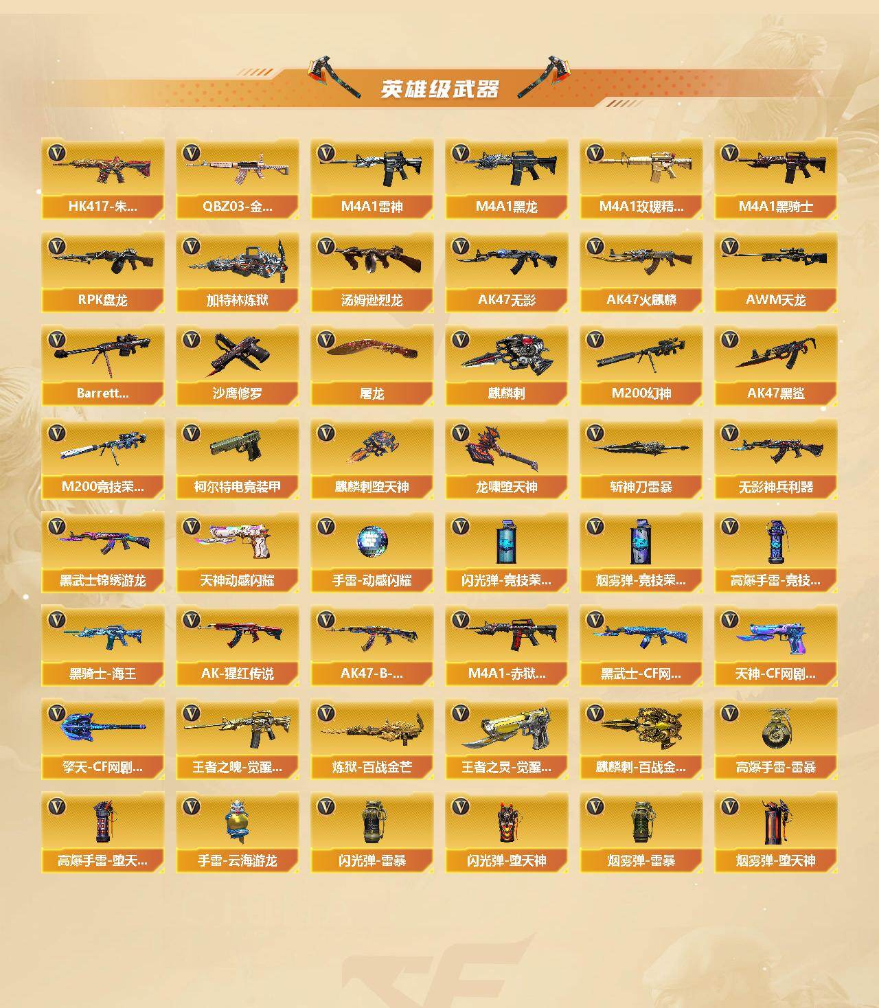【英雄级武器】:AK47-火麒麟*2,M4A1-黑龙,M4A1-雷神*3,M4A1-黑骑士*3,AK47-无影,AK47-黑鲨,HK417-朱雀,无影-神兵利器,黑武士-锦绣游龙,M4A1-玫瑰精灵*3,QBZ03-金色蔷薇,王者之魄-觉醒版,AK-47-猩红传说*2,AK47-B-战神,黑骑士-海王,黑武士-CF网剧冠军,AWM-天龙,Barrett-毁灭*3,M200-幻神,M200-竞技荣光,RPK-盘龙*4,加特林-炼狱,炼狱-百战金芒,汤姆逊-烈龙*6,沙鹰-修罗*2,柯尔特-电竞装甲,王者之灵-
