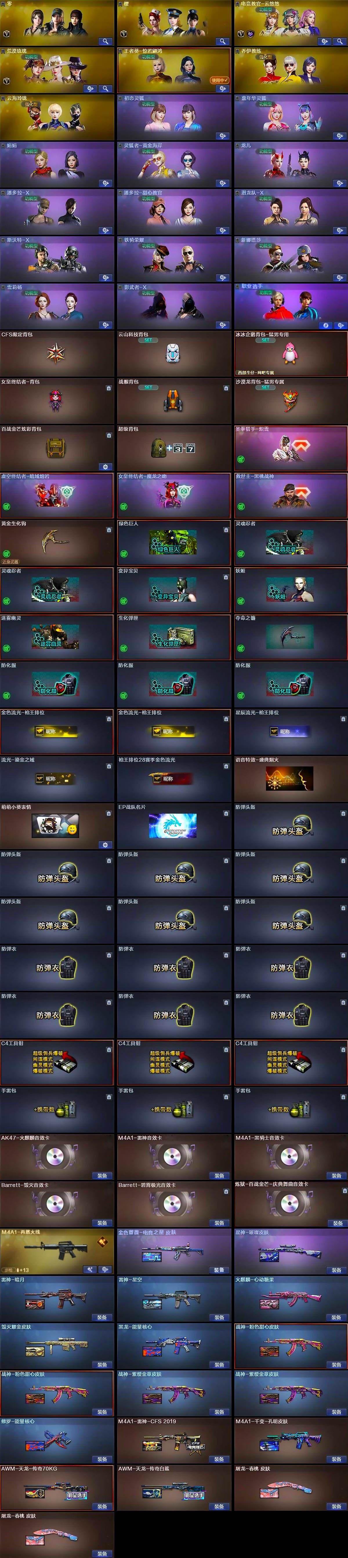 【皮肤】:金色蔷薇-电竞之星 皮肤,星神-璀璨皮肤,雷神-暗月,雷神-星空,M4A1-雷神-CFS 2019,M4A1-再燃火线,火麒麟-心动糖果,毁灭耀金皮肤,毁灭-英雄计划 皮肤,M4A1-千变-孔明皮肤,黑龙-能量核心,战神-粉色甜心皮肤*2,战神-紫绶金章皮肤*2,AWM-天龙-传奇70KG,AWM-天龙-传奇白鲨,修罗-能量核心,屠龙-春桃 皮肤*2,轻型军用手斧-再燃火线