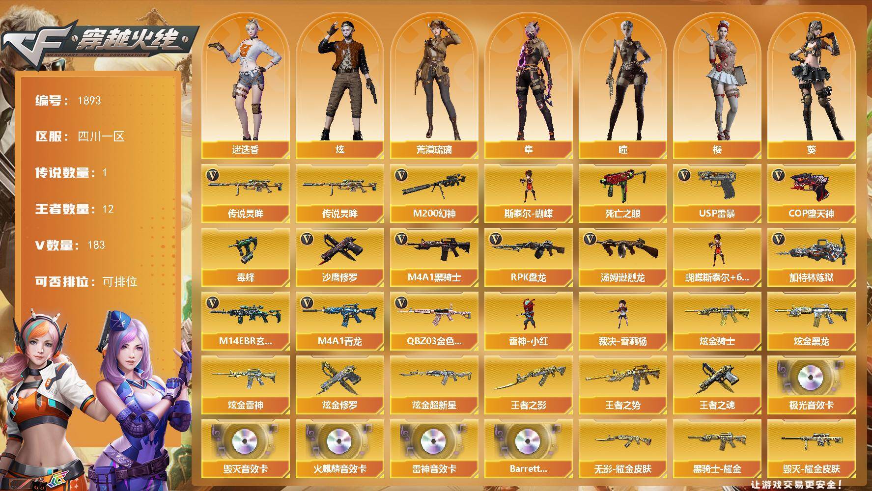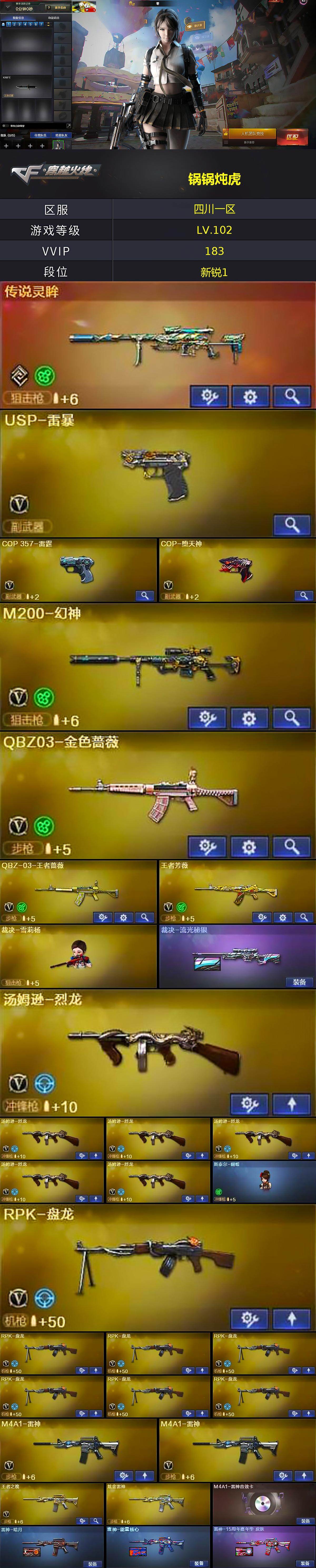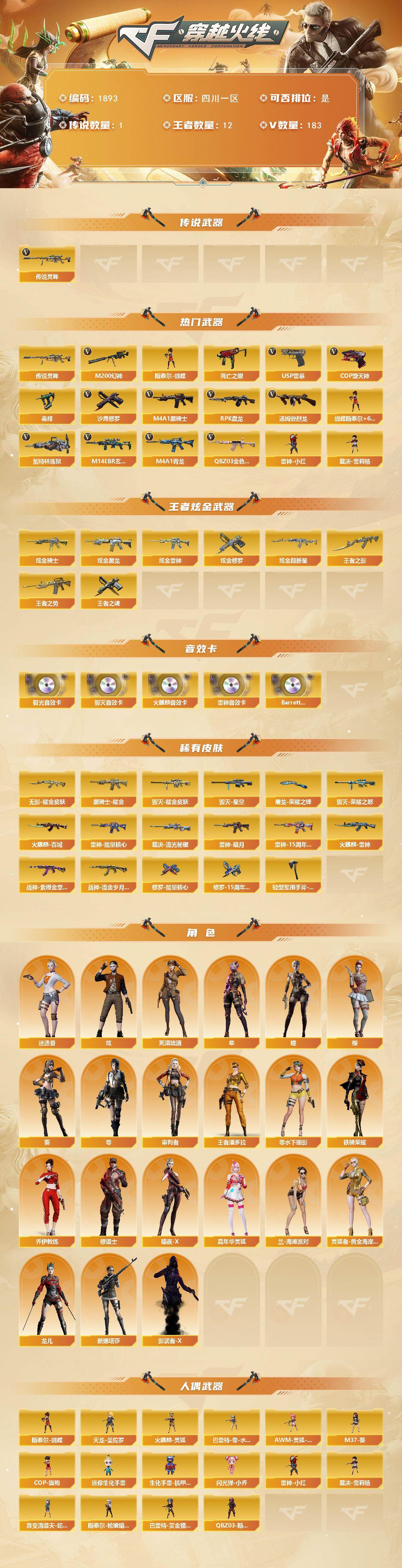 [16250865]四川一区-191V-12王者武器数-6炫金武器数 【传说武器】:传说灵眸 【热门武器】:传说灵眸,QBZ03-金色蔷薇,M14EBR-玄武,M4A1-青龙*2,M200-幻神,死亡之眼*2,毒蜂,M4A1-黑骑士*2,汤姆逊-烈龙*6,RPK-盘龙*7,加特林-炼狱*2,斯泰尔-蝴蝶,雷神-小红,裁决-雪莉杨,USP-雷暴,COP-堕天神,沙鹰-修罗*4 【王者炫金武器】:王者之势,王者之影,王者之魂,炫金骑士,炫金黑龙,炫金雷神,炫金超新星,炫金修罗*2 【音效卡】:AK47-火麒麟音效卡,M4A1-雷神音效卡,Barrett-毁灭音效卡,Barrett-极光音效卡,Barrett-碧霄极光音效卡 【皮肤】:裁决-流光秘银,雷神-暗月,雷神-能量核心,雷神-15周年嘉年华 皮肤,火麒麟-雷神,火麒麟-百城,毁灭-荣耀之怒,毁灭耀金皮肤,毁灭-星空,黑骑士耀金皮肤,无影耀金皮肤,战神-紫绶金章皮肤*3,战神-流金岁月皮肤*2,修罗-能量核心*2,修罗-15周年嘉年华 皮肤,屠龙-荣耀之锋,轻型军用手斧-再燃火线 【角色】:零,葵,樱,瞳,炫,迷迭香,荒漠琉璃,隼,审判者,王者潘多拉,乔伊教练,修道士,暗夜-X,嘉年华灵狐,兰-海滩派对,零-水下丽影,灵狐者-黄金海岸,龙儿,铁骑荣耀,新娜塔莎,影武者-X 【人偶武器】:雷神-小红,裁决-雪莉杨,天龙-曼陀罗,火麒麟-灵狐,异变清道夫-蛇影双骄,斯泰尔-蝴蝶,巴雷特-零-水下丽影,斯泰尔-枪娘暗刃,AWM-灵狐-15周年嘉年华,M37-葵,COP-旗袍,迷你生化手雷*3,生化手雷-机甲核心,闪光弹-小乔,巴雷特-赏金猎人,QBZ03-斯沃特 【暴走生化】:毒蜂,异变清道夫,KAC-狂怒咆哮,死亡之眼*2 【挑战大师】:神圣爆裂者III,冰龙粉碎者-白马银枪,激光毁灭者III,阐释者III 【英雄级武器】:M4A1-千变,AK47-火麒麟*3,M4A1-黑龙,M4A1-雷神*2,M4A1-黑骑士*2,AK47-无影*5,M4A1-死神,AK47-黑武士*2,AK12-天启,AN94-超新星*2,M4A1-武圣,AK47-机械迷城,AK47-黑鲨*2,M4A1-龙血*3,M4A1-雷霆,AK47-雷暴,M4A1-青龙*2,M4A1-堕天神,M4A1-幻灵,M14EBR-玄武,九霄圣角,M4A1-玫瑰精灵,QBZ03-金色
