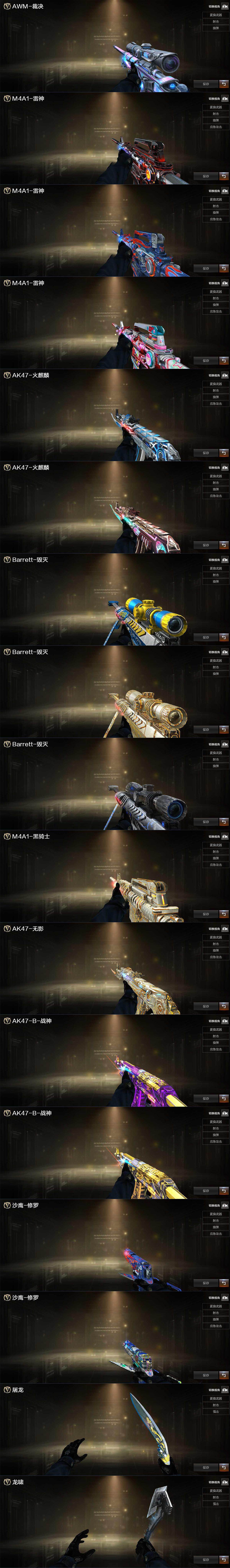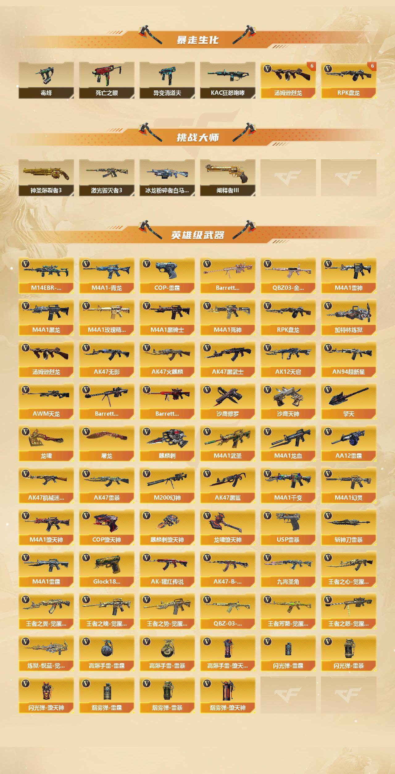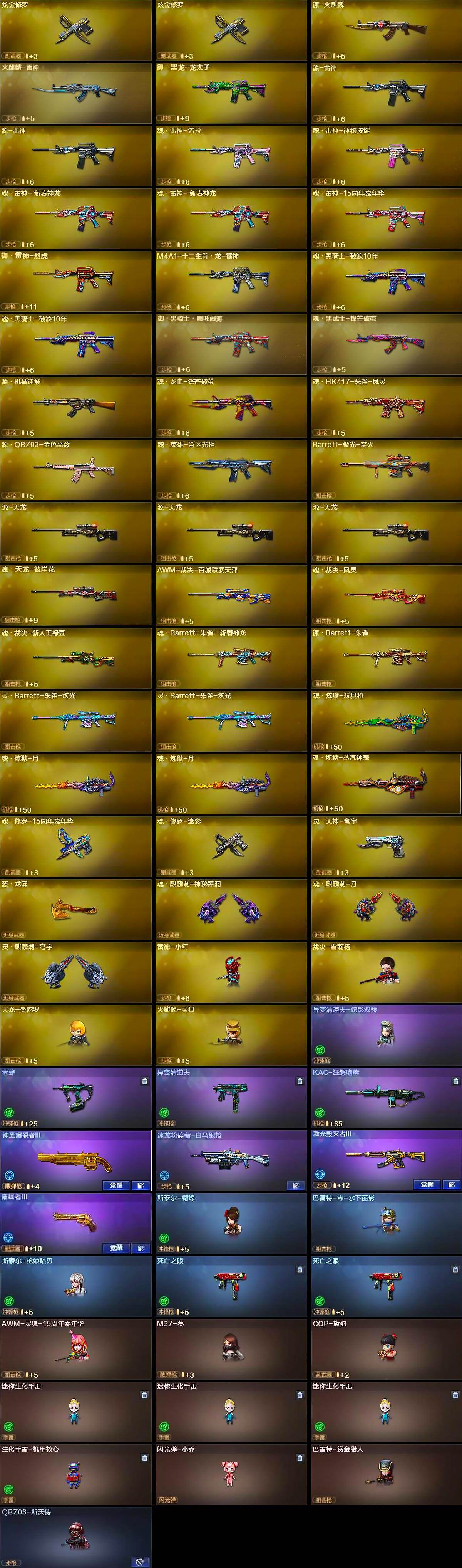 【英雄级武器】:M4A1-千变,AK47-火麒麟*3,M4A1-黑龙,M4A1-雷神*2,M4A1-黑骑士*2,AK47-无影*5,M4A1-死神,AK47-黑武士*2,AK12-天启,AN94-超新星*2,M4A1-武圣,AK47-机械迷城,AK47-黑鲨*2,M4A1-龙血*3,M4A1-雷霆,AK47-雷暴,M4A1-青龙*2,M4A1-堕天神,M4A1-幻灵,M14EBR-玄武,九霄圣角,M4A1-玫瑰精灵,QBZ03-金色