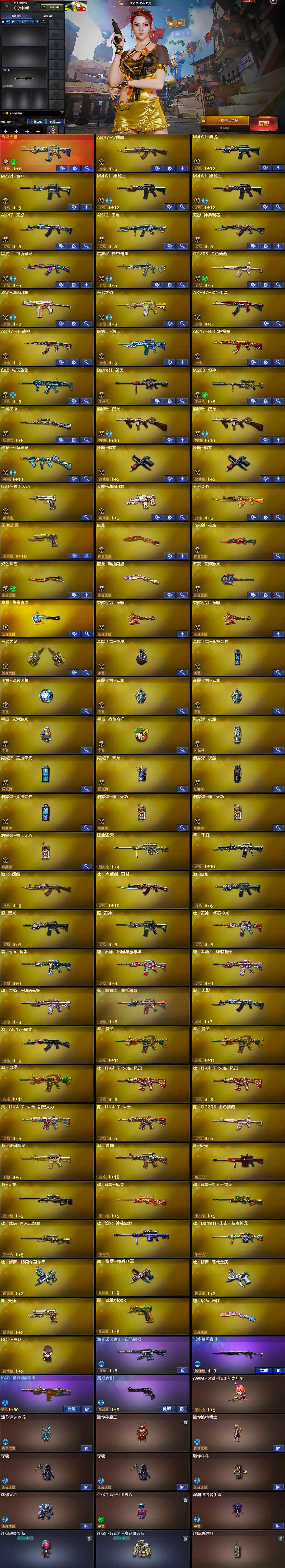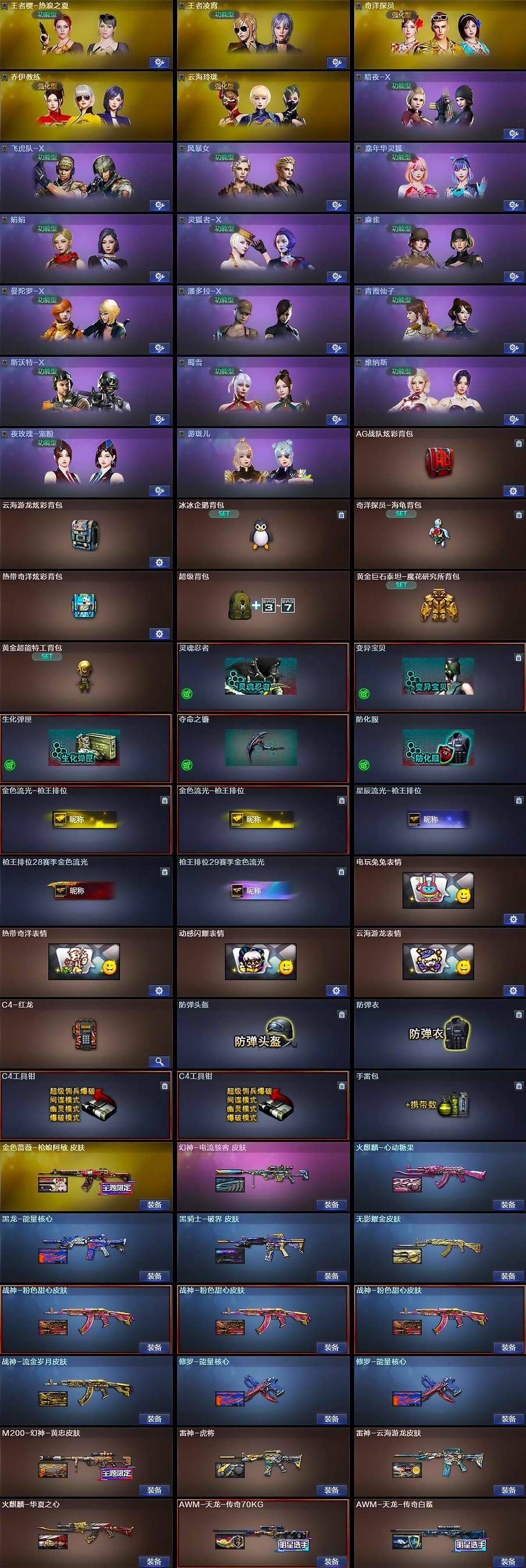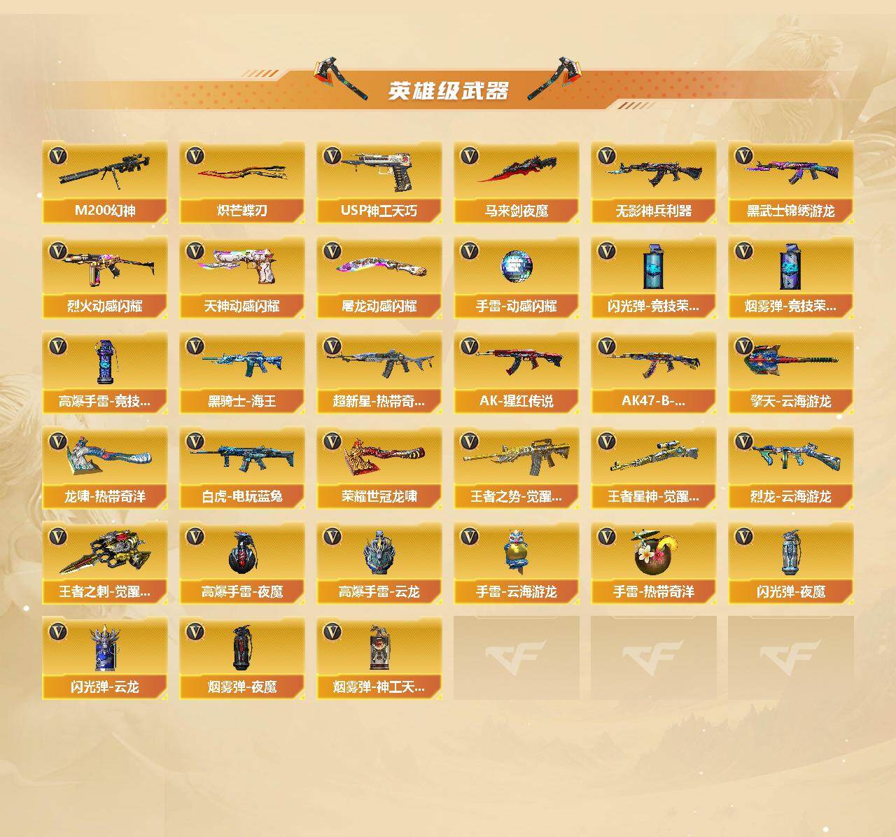 【英雄级武器】:AK47-火麒麟,M4A1-黑龙,M4A1-雷神,M4A1-黑骑士*2,AK47-无影,AK12-天启,无影-神兵利器,黑武士-锦绣游龙,超新星-热带奇洋,QBZ03-金色蔷薇,烈火-动感闪耀,王者之势-觉醒版,AK-47-猩红传说,AK47-B-战神,黑骑士-海王,AK47-B-常胜将军,白虎-电玩蓝兔,Barrett-毁灭,M200-幻神,王者星神-觉醒版,汤姆逊-烈龙*2,烈龙-云海游龙,沙鹰-修罗*2,USP-神工天巧,天神-动感闪耀,屠龙,马来剑-夜魔,炽芒蝶刃,屠龙-动感闪耀,擎天-云海游龙,龙啸-热带奇洋,荣耀世冠-龙啸*2,王者之刺-觉醒版,高爆手雷-夜魔,高爆手雷-竞技荣光,手雷-动感闪耀,高爆手雷-云龙*2,手雷-云海游龙,手雷-热带奇洋,闪光弹-夜魔,闪光弹-竞技荣光,闪光弹-云龙,烟雾弹-夜魔,烟雾弹-竞技荣光,烟雾弹-神工天巧*3