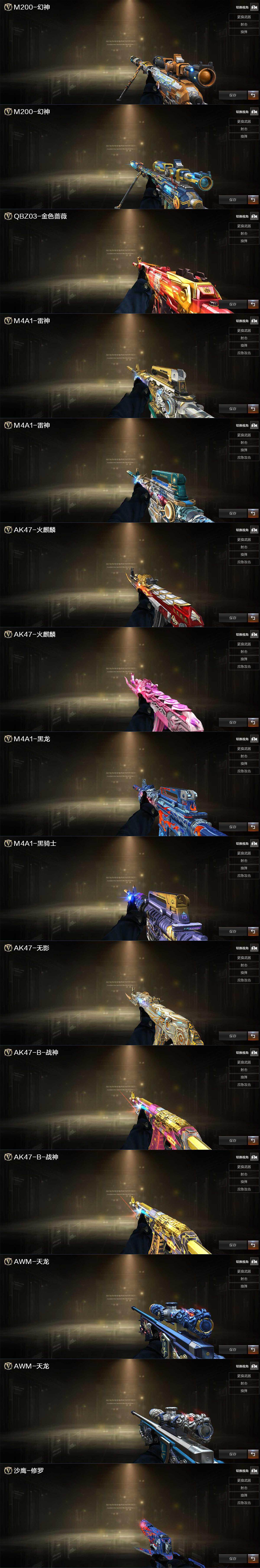 【热门武器】:传说光耀,QBZ03-金色蔷薇,M200-幻神,白虎-电玩蓝兔,王者炎心,M4A1-黑骑士*2,汤姆逊-烈龙*2,COP-白鲨,沙鹰-修罗*2,炽芒蝶刃,荣耀世冠-龙啸*2
