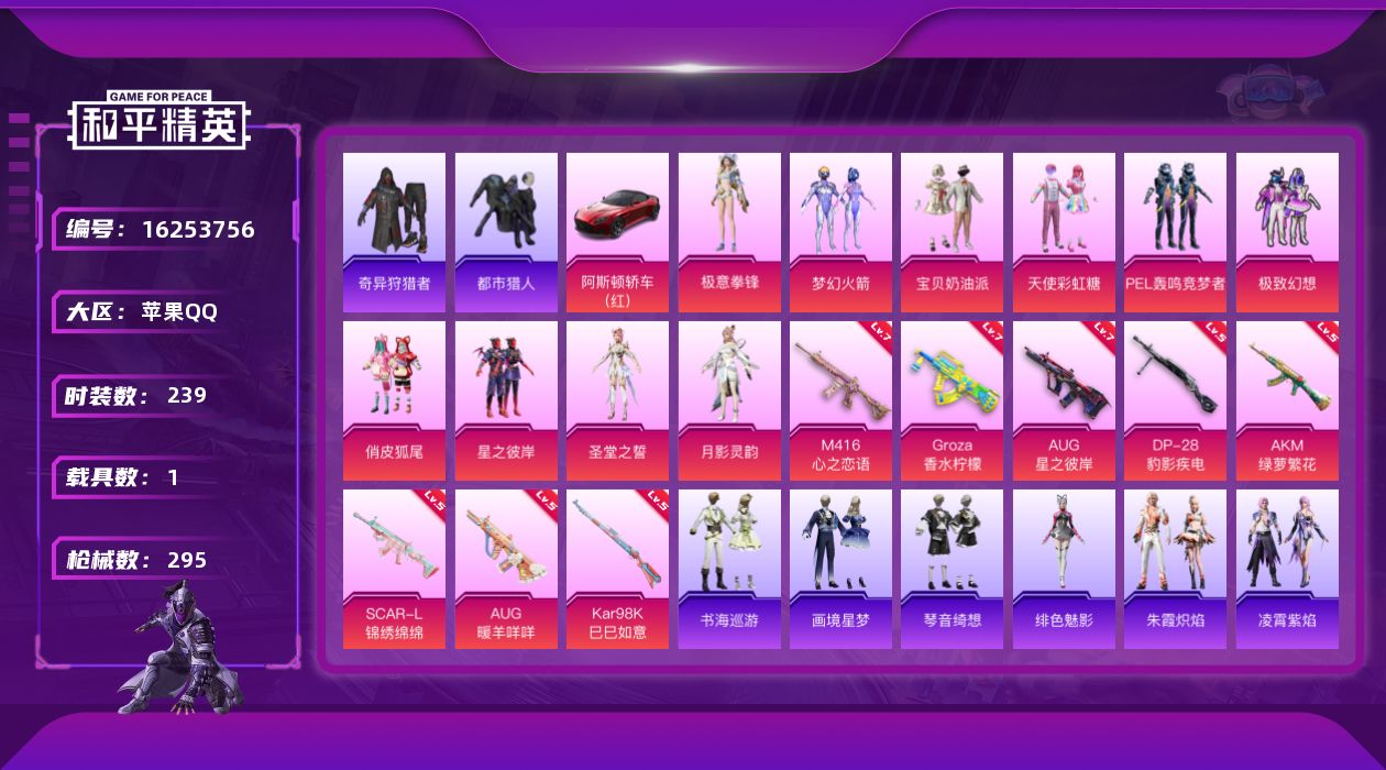 [16253756]【特价出售/店主推荐】 苹果 手Q-10粉装-8特效枪-1载具-6粉色飞行器-98295热力值-14王牌印记-239套装-295枪皮 【热门品类】:粉装-梦幻火箭,套装-浪漫天命,套装-都市猎人,套装-小丑鱼,套装-奇异狩猎者,套装-SS1特训,套装-潮萌小黄鸭,套装-浪漫波比 【粉色套装】:粉装-宝贝奶油派,粉装-天使彩虹糖,粉装-梦幻火箭,粉装-PEL轰鸣竞梦者,粉装-极致幻想,粉装-俏皮狐尾,粉装-星之彼岸,角色-圣堂之誓,角色-月影灵韵,粉装-极意拳锋 【粉色枪皮等级】:AKM-绿萝繁花(五级),SCAR-L-锦绣绵绵(五级),M416-心之恋语(七级),GROZA-香水柠檬(七级),AUG-星之彼岸(七级),AUG-暖羊咩咩(五级),Kar98K-巳巳如意(五级),DP-28-豹影疾电(五级) 【粉色载具】:阿斯顿马丁DBS(红) 【粉色枪皮】:AKM-绿萝繁花,SCAR-L-锦绣绵绵,M416-心之恋语,GROZA-香水柠檬,AUG-星之彼岸,AUG-暖羊咩咩,Kar98K-巳巳如意,DP-28-豹影疾电 【粉色飞行器】:梦幻火箭飞行器,绮梦青鸾飞行器,花傲天飞行器,动力核心飞行器,极意拳锋飞行器 【粉色降落伞】:幻影战神降落伞,百万伏特降落伞,甜心宝贝降落伞,精灵迷巫降落伞,炫紫旋律降落伞,神秘黑猫降落伞,繁花小夜曲降落伞,心之恋语降落伞,荧光虫舞降落伞,星之彼岸降落伞,洛神天依降落伞,萌物绒绒降落伞,莲影清波降落伞,小叽联名款降落伞,英伦信使降落伞,千金淑猫降落伞,临安公主降落伞,幻彩电音降落伞,绯穹魔姬降落伞,异瞳寒姬降落伞,炫彩糖果降落伞 【稀有套装】:套装-巳巳如意,套装-雪国风尚,套装-炫彩糖果,角色-都市丽猫,角色-怀庆长公主,套装-燕燕于飞,套装-鱼渊荷华,套装-星影赞美诗,套装-朱霞炽焰,套装-凌霄紫焰,角色-绯色魅影,套装-书海巡游,套装-画境星梦,套装-琴音绮想 【稀有枪皮】:AUG-冰晶雪宝,AKM-四圣焕新,AKM-夜灯,AKM-奇异狩猎者,AKM-彩虹符号,AKM-影袭,AKM-星之彼岸,AKM-春暖花开,AKM-环太平洋,AKM-生命誓言,AKM-阿狸红,AKM-霓虹街区,M16A4-幻世战舞者,M16A4-生命誓言,M16A4-红色方程式,SCAR-L-夏日绵绵冰,SCAR-L-炫彩节奏,SCAR-L-生命誓言,SCAR