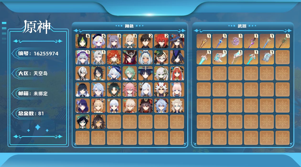 0命克洛琳德,0命阿蕾奇诺,0命闲云,0命芙宁娜,1命那维莱特,0命白术,0命迪希雅,0命流浪者,0命纳西妲,0命妮露,满命提纳里,0命夜兰,0命神里绫人,0命八重神子,0命申鹤,0命荒泷一斗,0命雷电将军,0命枫原万叶,0命神里绫华,2命钟离,0命胡桃,0命甘雨,0命魈,0命宵宫,0命温迪,0命阿贝多,0命珊瑚宫心海,3命刻晴,5命七七,3命琴,2命莫娜,2命迪卢克,0命玛拉妮,0命艾梅莉埃,0命恰斯卡,0命玛薇卡,1命梦见月瑞希,0命丝柯克,0命菈乌玛,0命杜林,精1圣显之钥,精1波乱月白经津,精1不灭月华,精1雾切之回光,精1苍古自由之誓,精1四风原典,精1和璞鸢,精1天空之翼,精1天空之刃,精1天空之卷,精1天空之傲