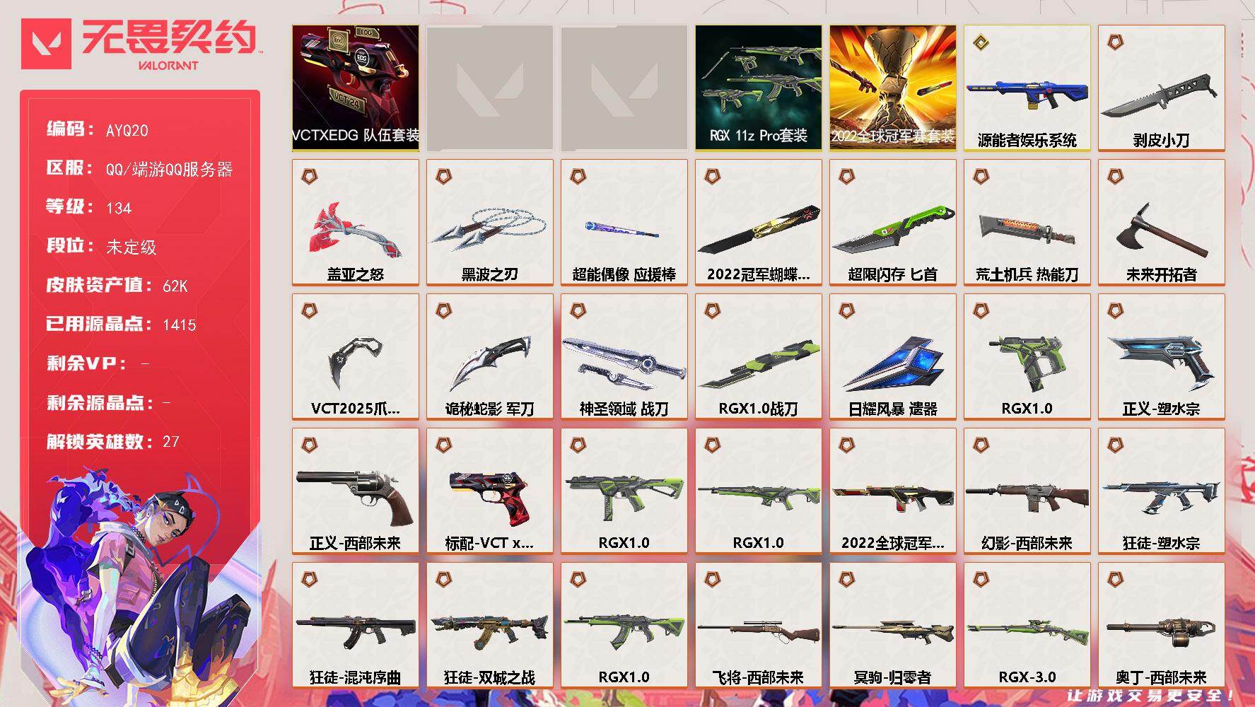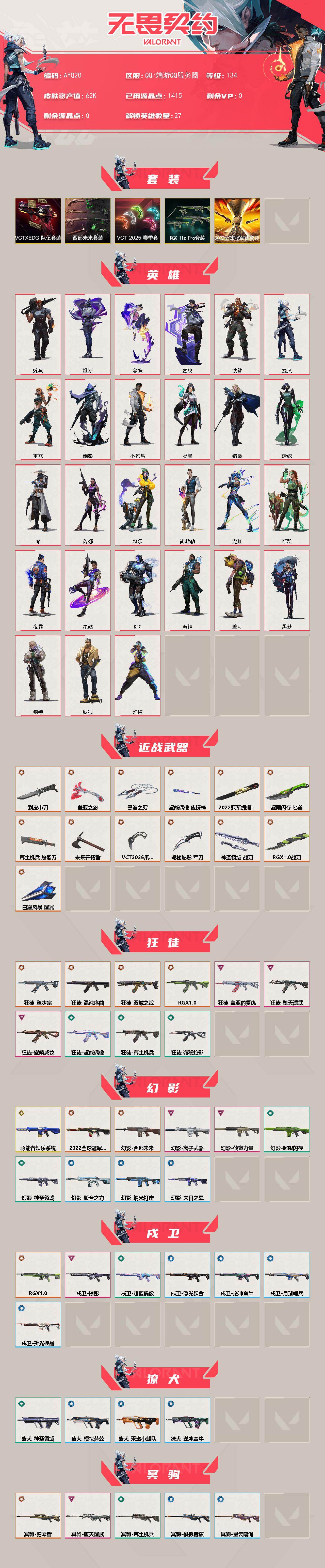 [16257234]【特价出售/店主推荐】 【套装】:2022全球冠军赛套装,RGX 11z Pro套装,VCT 2025 赛季套装,西部未来套装,VCTxEDG 队伍套装 【英雄】:幻棱,炼狱,维斯,暮蝶,钛狐,壹决,铁臂,捷风,雷兹,幽影,不死鸟,贤者,猎枭,蝰蛇,零,芮娜,奇乐,尚勃勒,霓虹,斯凯,夜露,星礈,K/O,海神,盖可,黑梦,钢锁 【近战武器】:近战武器-2022全球冠军赛 蝴蝶刀,近战武器-RGX 11z Pro 战刀,近战武器-剥皮小刀,近战武器-VCT 2025 爪刀,近战武器-黑波之刃,近战武器-未来开拓者,近战武器-超能偶像 应援棒,近战武器-超限闪存 匕首,近战武器-盖亚之怒,近战武器-荒土机兵 热能刀,近战武器-诡秘蛇影 军刀,近战武器-神圣领域 战刀,近战武器-日耀风暴 遗器 【狂徒】:狂徒-混沌序曲,狂徒-双城之战,狂徒-塑水宗,狂徒-RGX 11z Pro,狂徒-堕天遗武,狂徒-盖亚的复仇,狂徒-耀鳞威龙,狂徒-超能偶像,狂徒-荒土机兵,狂徒-诡秘蛇影 【幻影】:幻影-源能者娱乐系统,幻影-2022全球冠军赛,幻影-西部未来,幻影-离子武器,幻影-侦察力量,幻影-超限闪存,幻影-神圣领域,幻影-聚合之力,幻影-纳米打击,幻影-末日之翼,幻影-西部未来 【戍卫】:戍卫-RGX 11z Pro,戍卫-掠影,戍卫-超能偶像,戍卫-浮光跃金,戍卫-逆冲蛮牛,戍卫-月球哨兵,戍卫-折光棱晶 【獠犬】:獠犬-神圣领域,獠犬-采蜜小蜂队,獠犬-模拟赫兹,獠犬-逆冲蛮牛 【冥驹】:冥驹-归零者,冥驹-堕天遗武,冥驹-荒土机兵,冥驹-模拟赫兹,冥驹-星云暗涌 【飞将】:飞将-西部未来,飞将-聚合之力,飞将-末日之翼 【莽侠】:莽侠-RGX 11z Pro//3.0,莽侠-超限闪存,莽侠-诡秘蛇影,莽侠-月球哨兵 【战神】:战神-盖亚的复仇//2.0,战神-神圣领域,战神-采蜜小蜂队,战神-浮光跃金 【奥丁】:奥丁-西部未来,奥丁-纳米打击,奥丁-末日之翼 【判官】:判官-超能偶像,判官-诡秘蛇影,判官-采蜜小蜂队,判官-纳米打击x 【雄鹿】:雄鹿-模拟赫兹,雄鹿-逆冲蛮牛,雄鹿-月球哨兵 【骇灵】:骇灵-荒土机兵,骇灵-浮光跃金,骇灵-星云暗涌 【蜂刺】:蜂刺-RGX 11z Pro,蜂刺-超限闪存,蜂刺-聚合之力,蜂刺-星云暗涌,蜂刺-折光棱晶 【标配】:标配-超