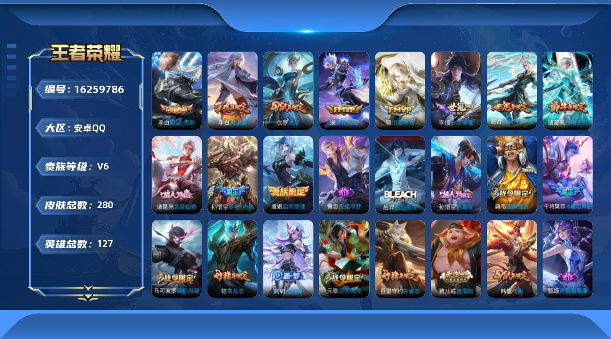 [16259786]安卓Q-V6-127英雄-280皮肤-1典藏皮肤-10传说-76史诗