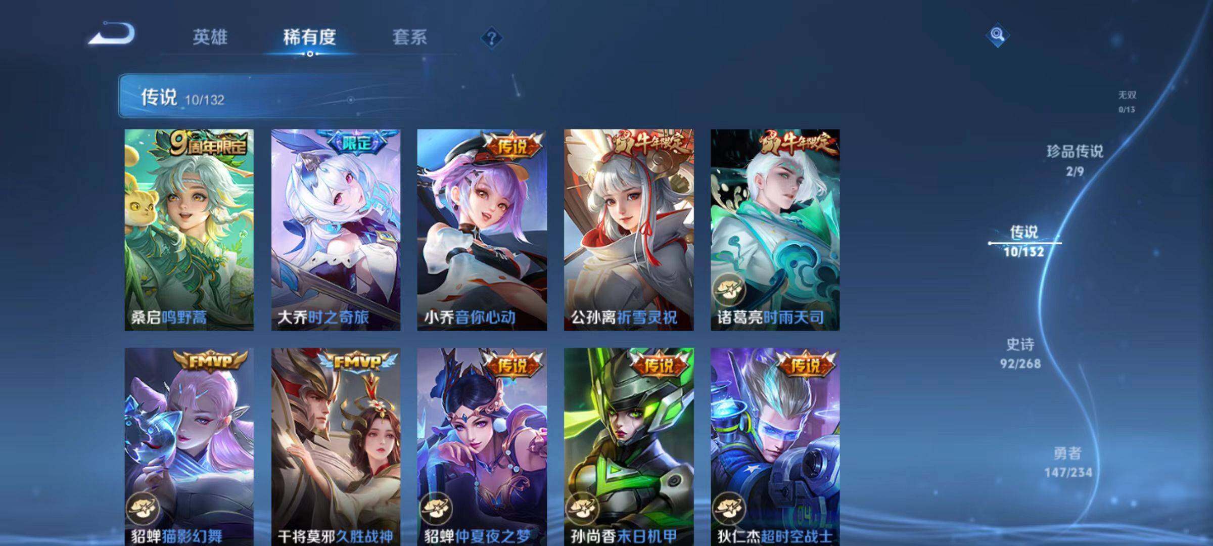 【传说皮肤】:桑启鸣野蒿,大乔时之奇旅,小乔音你心动,公孙离祈雪灵祝,诸葛亮时雨天司,貂蝉猫影幻舞,干将莫邪久胜战神,貂蝉仲夏夜之梦,孙尚香末日机甲,狄仁杰超时空战士