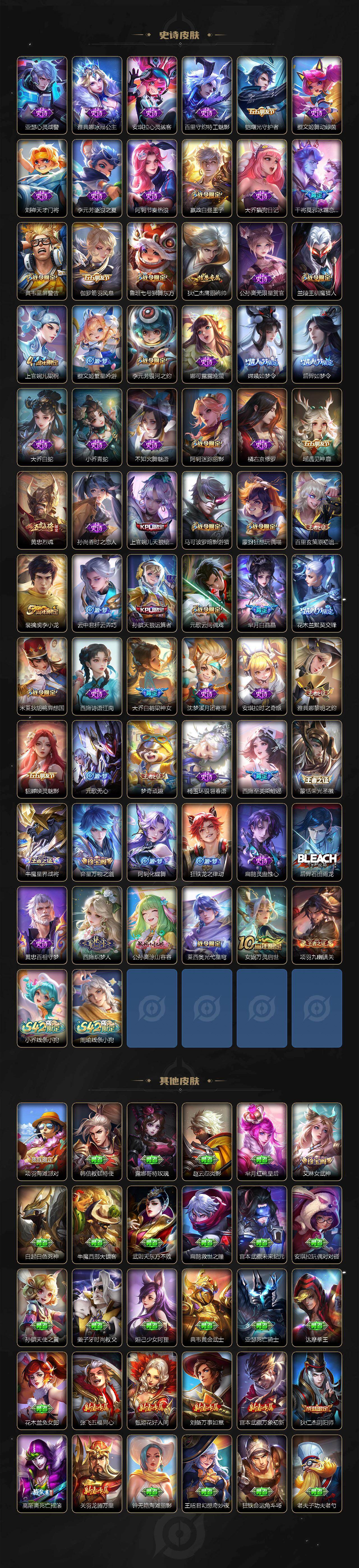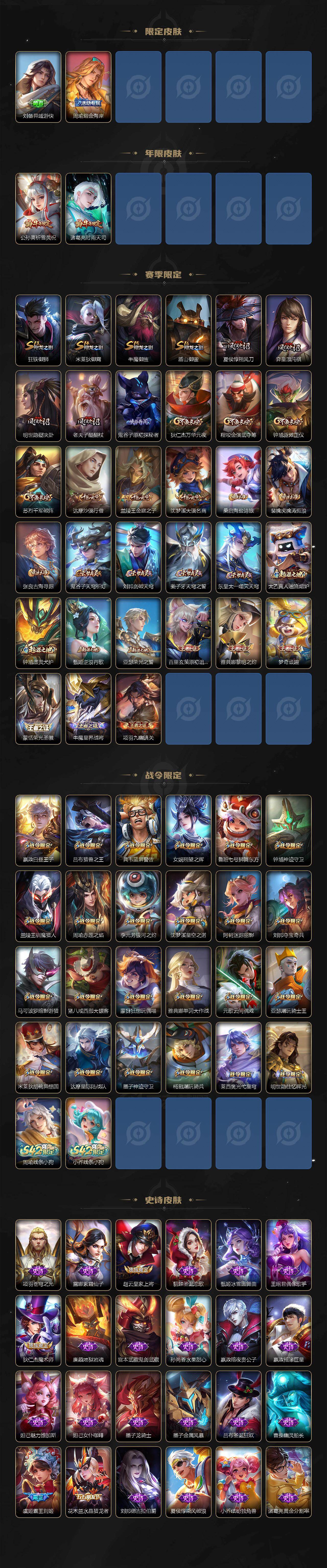 【限定皮肤】:大乔绒语心约,姜子牙天穹之誓,杨戬破阵退雄兵,狄仁杰阴阳师,赵云皇家上将,墨子神迹守卫,嬴政白昼王子,鲁班七号狮舞东方,高渐离死亡摇滚,阿轲迷踪丽影,孙膑天狼运算者,芈月白晶晶,吕布猎兽之王,周瑜赤莲之焰,元歌云间偶戏,元歌无心,夏侯惇朔风刀,典韦蓝屏警告,马可波罗暗影游猎,狄仁杰魔术师,狄仁杰万华元夜,达摩星际陆战队,达摩沙漠行僧,项羽海滩派对,老夫子醍醐杖,程咬金演武夺筹,刘邦夺宝奇兵,兰陵王驯魔猎人,兰陵王金庭之子,花木兰默契交锋,亚瑟潮玩骑士王,牛魔御旌,后羿如梦令,李元芳银河之约,虞姬霸王别姬,钟馗神迹守卫,钟馗驱傩正仪,杨戬潮玩骑兵,女娲朔望之晖,干将莫邪冰霜恋舞曲,雅典娜单词大作战,雅典娜黎明之约,蔡文姬繁星吟游,太乙真人华丽摇滚,鬼谷子原初探秘者,诸葛亮时雨天司,大乔白鹤梁神女,大乔时之奇旅,黄忠烈魂,苏烈千军破阵,百里玄策原初追逐者,弈星混沌棋,梦奇顽趣,公孙离祈雪灵祝,沈梦溪星空之诺,沈梦溪大漠名商,明世隐疑决卦,裴擒虎李小龙,裴擒虎擒涛扼浪,狂铁御狮,米莱狄御霄,米莱狄胡桃异想国,云中君纤云弄巧,盾山御銮,猪八戒西部大镖客,上官婉儿梁祝,上官婉儿天狼绘梦者,嫦娥如梦令,西施至美乘鲤谣,蒙犽狂想玩偶喵,桑启海盐诗旅,艾琳女武神,张良古海寻踪,蒙恬荣光圣徽,鬼谷子天穹祈灯,沈梦溪龙舞盛年,刘邦剑破天穹,程咬金群星魔术团,刘备异域游侠,周瑜熔金海岸