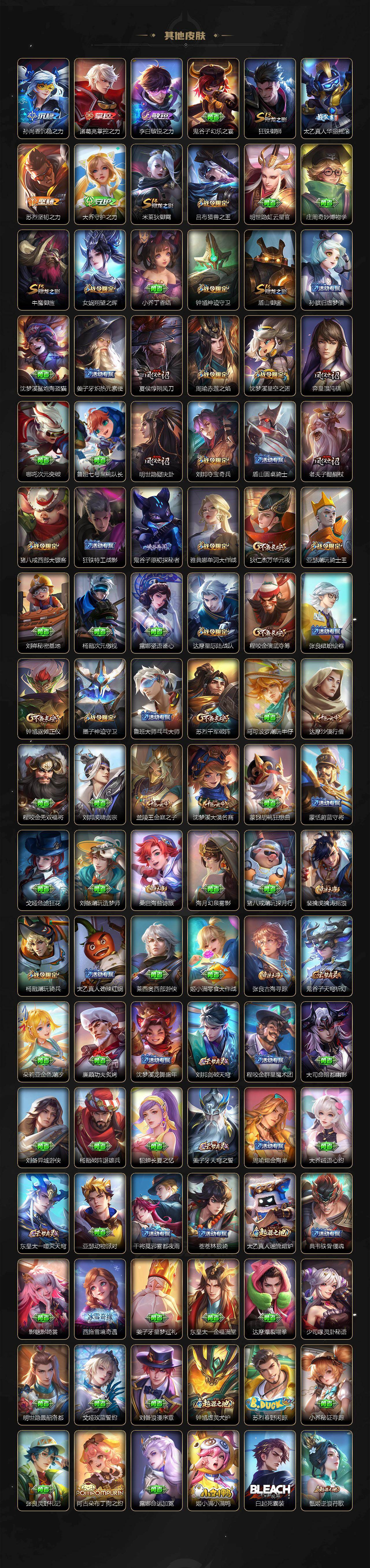【赛季限定】:狂铁御狮,米莱狄御霄,牛魔御旌,盾山御銮,夏侯惇朔风刀,弈星混沌棋,明世隐疑决卦,老夫子醍醐杖,鬼谷子原初探秘者,狄仁杰万华元夜,程咬金演武夺筹,钟馗驱傩正仪,苏烈千军破阵,达摩沙漠行僧,兰陵王金庭之子,沈梦溪大漠名商,桑启海盐诗旅,裴擒虎擒涛扼浪,张良古海寻踪,鬼谷子天穹祈灯,刘邦剑破天穹,姜子牙天穹之誓,东皇太一噬灭天穹,太乙真人谧流熔炉,钟馗虚灵犬护,甄姬逆浪荇歌,亚瑟荣光之