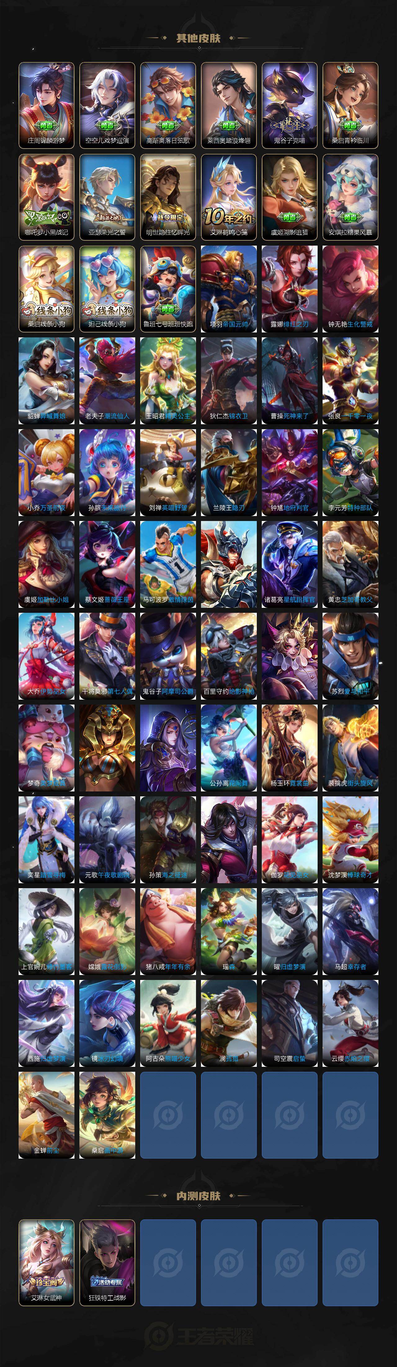 小乔青蛇,大乔白蛇,瑶遇见神鹿,娜可露露晚萤,伽罗箭羽风息,李元芳逐浪之夏,不知火舞魅语,公孙离无限星赏官,大乔猫狗日记,阿轲节奏热浪,露娜紫霞仙子,诸葛亮黄金分割率,王昭君偶像歌手,项羽苍穹之光,孙尚香时之恋人,雅典娜冰冠公主,橘右京修罗,墨子龙骑士,嬴政摇滚巨星,刘禅天才门将,安琪拉心灵骇客,安琪拉时之奇旅,刘邦德古拉伯爵,曹操幽灵船长,宫本武藏鬼剑武藏,亚瑟心灵战警,蔡文姬舞动绿茵,廉颇地狱岩魂,西施诗语江南,小乔缤纷独角兽,夏侯惇乘风破浪,花木兰水晶猎龙者,铠曙光守护者,墨子金属风暴,百里玄策原初追逐者,吕布圣诞狂欢,貂蝉圣诞恋歌,百里守约特工魅影,嬴政暗夜贵公子,雅典娜黎明之约,貂蝉唤灵魅影,杨玉环银翎春语