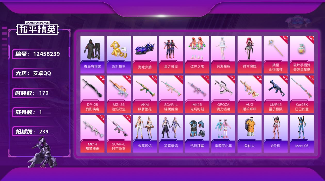 [12458239]【825】安卓 手Q-5粉装-13特效枪-1载具-0粉色飞行器-78172热力值-15王牌印记-170套装-239枪皮