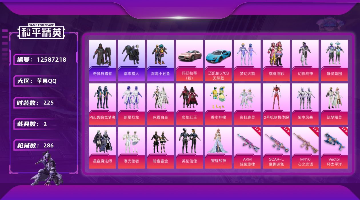 [12587218]【960】苹果 手Q-18粉装-6特效枪-2载具-2粉色飞行器-102359热力值-18王牌印记-225套装-286枪皮