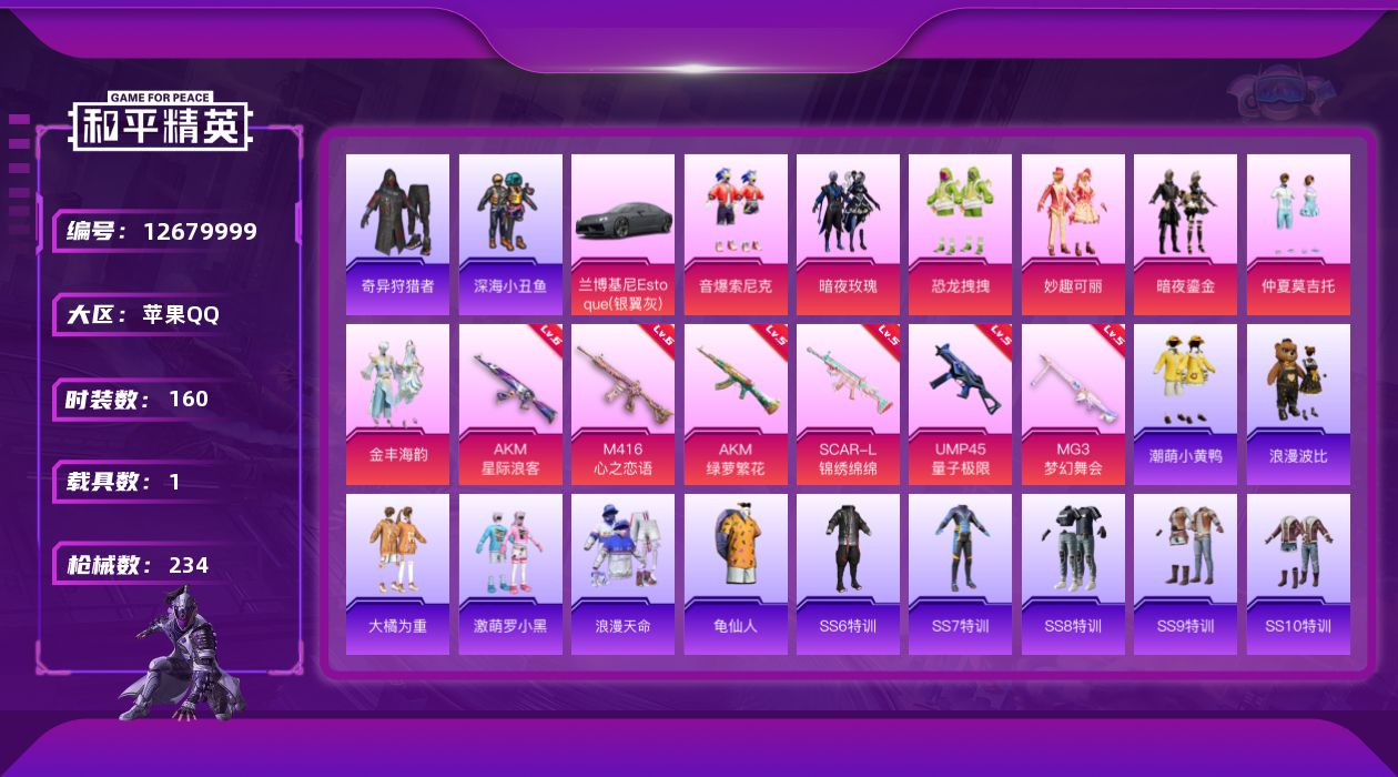 [12679999]【1117】苹果 手Q-7粉装-6特效枪-1载具-2粉色飞行器-77687热力值-8王牌印记-160套装-234枪皮