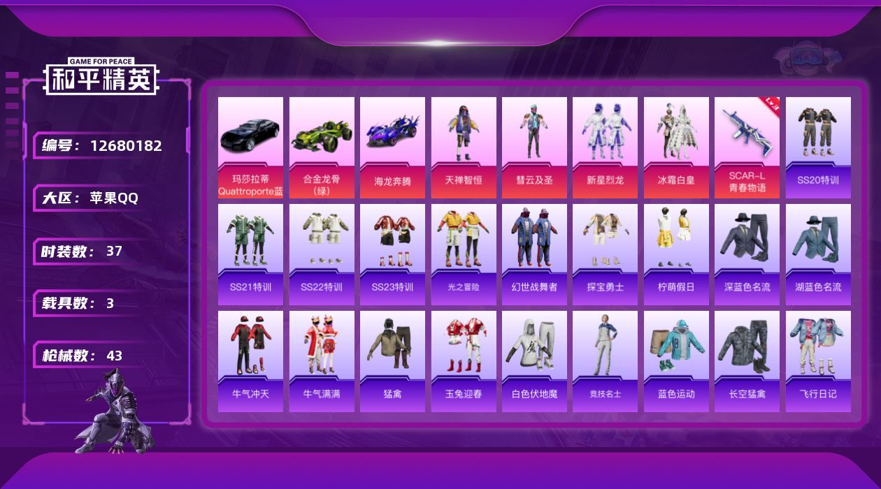 [12680182]【1120】苹果 手Q-4粉装-1特效枪-3载具-2粉色飞行器-17980热力值-1王牌印记-37套装-43枪皮 【粉色载具】:玛莎拉蒂Quattroporte(夜幕蓝),合金龙骨(绿),海龙奔腾 【粉色套装】:粉装-天禅智恒,粉装-彗云及圣,粉装-新星烈龙,粉装-冰霜白皇 【粉色枪皮等级】:SCAR-L-青春物语(三级) 【粉色枪皮】:SCAR-L-青春物语 【粉色飞行器】:青春物语飞行器,千面幻镜飞行器 【粉色降落伞】:梦幻火箭降落伞,闪光银龙降落伞,垂柳戏鸭降落伞,千面幻镜降落伞 【稀有枪皮】:AKM-冰凉西瓜,AKM-破晓战魂,M16A4-幻世战舞者,M16A4-甜心亚梦,SCAR-L-玉兔迎春,M416-糯团青竹,M416-红色方程式,AUG-耀粉歌者,M762-天降萌叽,AC-VAL-天降萌叽,AC-VAL-甜心亚梦,蜜獾-千面幻镜,蜜獾-垂柳戏鸭,蜜獾-天降萌叽,蜜獾-娇憨猪猪,UZI-娇憨猪猪,UMP45-生命誓言,UMP45-蓝色火焰,汤姆逊-耀粉歌者,Mini14-千面幻镜,Mini14-梦幻火箭,SLR-娇憨猪猪,SLR-彩虹符号,S686-红色方程式,S1897-炫彩节奏,S12K-童趣迷兔,S12K-娇憨猪猪,S12K-幻世战舞者,DBS-甜心亚梦,M249-糯团青竹,DP-28-彩虹符号,DP-28-甜心亚梦,MG3-幻世战舞者 【其他套装】:套装-SS20特训,套装-SS21特训,套装-SS22特训,套装-SS23特训,套装-光之冒险,套装-幻世战舞者,套装-探宝勇士,套装-柠萌假日,套装-深蓝色名流,套装-湖蓝色名流,套装-牛气冲天,套装-牛气满满,套装-猛禽,套装-玉兔迎春,套装-白色伏地魔,套装-竞技名士,套装-蓝色运动,套装-长空猛禽,套装-飞行日记,套装-麻辣教官,套装-黑色伏地魔,套装-沙漠毒蛇,套装-极地朋克,套装-风暴特警,套装-冰川特警,套装-凛冬战士,套装-甜心亚梦,套装-虚音幻奏,套装-娇憨猪猪,套装-萌趣咩咩,套装-夏雨游龙,角色-李逍遥,角色-酒剑仙 【稀有背包】:梦幻火箭背包(3级),梦幻火箭背包(2级),梦幻火箭背包(1级) 【营地ID】:920294036