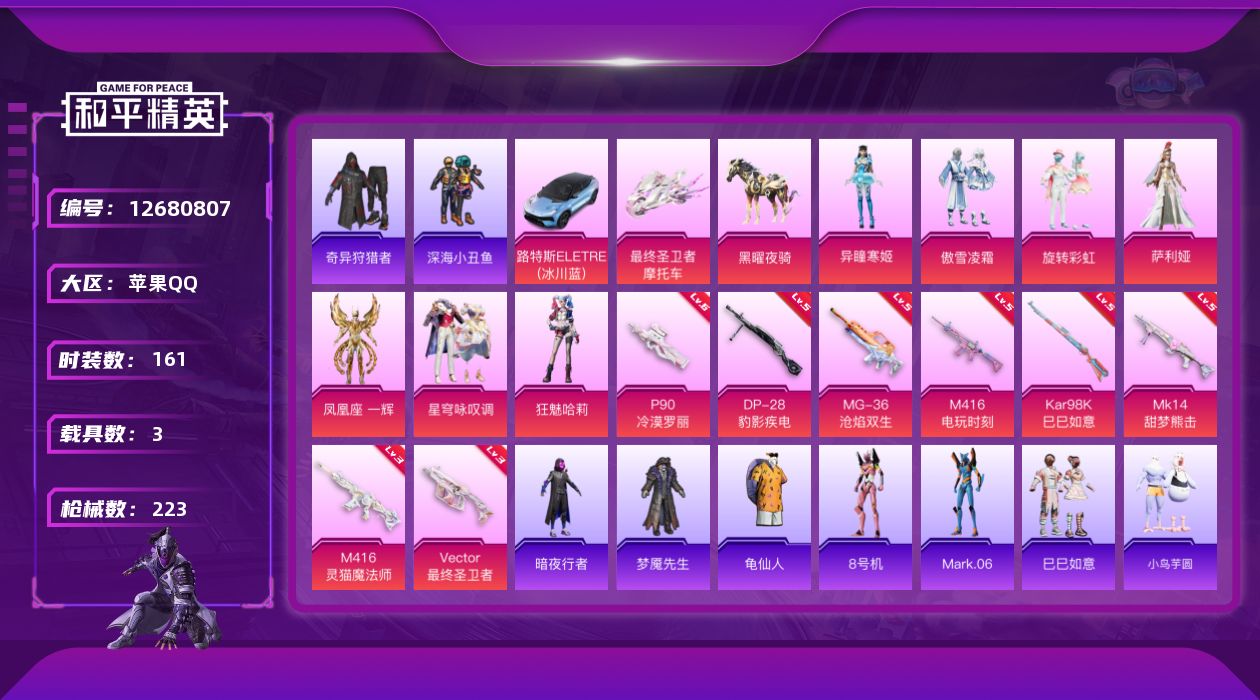 [12680807]【1127】苹果 手Q-7粉装-8特效枪-3载具-3粉色飞行器-69572热力值-7王牌印记-161套装-223枪皮 【热门品类】:套装-深海小丑鱼,套装-奇异狩猎者,套装-暗夜行者,套装-龟仙人,角色-8号机,角色-Mark.06 【粉色载具】:路特斯ELETRE(冰川蓝),最终圣卫者摩托车,黑曜夜骑 【粉色套装】:粉装-傲雪凌霜,粉装-旋转彩虹,角色-萨利娅,角色-凤凰座 一辉,粉装-星穹咏叹调,角色-狂魅哈莉,角色-异瞳寒姬 【粉色枪皮等级】:M416-电玩时刻(五级),M416-灵猫魔法师(三级),Vector-最终圣卫者(三级),P90-冷漠罗丽(六级),Kar98K-巳巳如意(五级),Mk14-甜梦熊击(五级),DP-28-豹影疾电(五级),MG-36-沧焰双生(五级) 【粉色枪皮】:M416-电玩时刻,M416-灵猫魔法师,Vector-最终圣卫者,P90-冷漠罗丽,Kar98K-巳巳如意,Mk14-甜梦熊击,DP-28-豹影疾电,MG-36-沧焰双生 【粉色飞行器】:荒漠赏金飞行翼,终晖之翼飞行器,灵猫魔法师飞行器 【粉色降落伞】:筑梦精灵降落伞,荒漠赏金降落伞,环太平洋降落伞,千面幻镜降落伞,BEARBRICK降落伞,未来领航者降落伞,千金淑猫降落伞,圣域龙灵降落伞,智耀战神降落伞,星穹咏叹调降落伞,双重狂想降落伞,最终圣卫者降落伞,冷漠罗丽降落伞,灵猫魔法师降落伞 【稀有套装】:套装-龟仙人,套装-巳巳如意,套装-小鸟芋圆,套装-雏菊兔兔,套装-萝兰蝴蝶,套装-小熊娃娃,角色-多纳泰罗,套装-糖糖葫芦,套装-青团波波,角色-摩登魅猫,套装-燕燕于飞,套装-鱼渊荷华,套装-樱梦幻音,套装-粉恋花,套装-紫幽梦,套装-蓝冰羽,角色-猎影月神,角色-瑰梦爱神,套装-星影赞美诗,套装-极速光影,套装-彩虹兔,套装-云朵鹅,套装-雪绒豹,套装-诡诞巡游 【稀有枪皮】:AKM-彩虹符号,AKM-环太平洋,AKM-破晓战魂,AKM-龙的传人,AKM-灵猫魔法师,M16A4-幻世战舞者,M16A4-甜心亚梦,M16A4-红色方程式,M16A4-蓝色火焰,M16A4-最终圣卫者,SCAR-L-夜灯,SCAR-L-炫彩节奏,SCAR-L-玉兔迎春,SCAR-L-红色方程式,SCAR-L-冷漠罗丽,M416-暗夜行者,M416-月影鸳鸯,M416-糯团青竹,M416