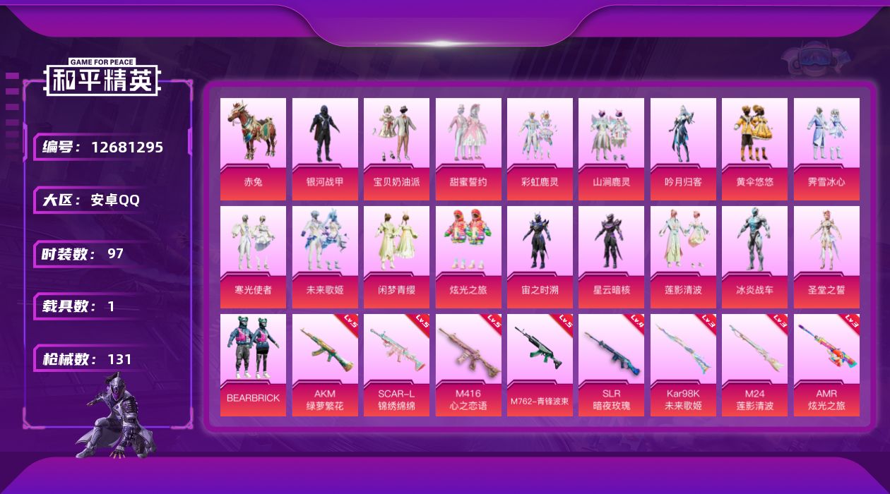 [12681295]【1133】安卓 手Q-18粉装-9特效枪-1载具-6粉色飞行器-49395热力值-2王牌印记-97套装-131枪皮