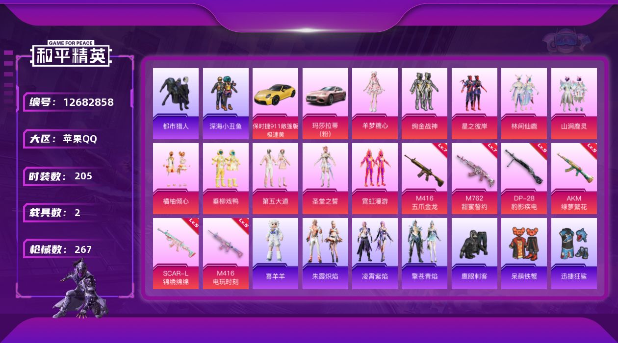 [12682858]【1140】苹果 手Q-10粉装-6特效枪-2载具-1粉色飞行器-89483热力值-18王牌印记-205套装-267枪皮 【热门品类】:绝对防御上衣,套装-浪漫天命,套装-都市猎人,套装-深海小丑鱼,套装-小丑鱼,角色-军刀雅典娜,套装-金羽特工,套装-星河浪客,套装-龟仙人,套装-粉红小猪 【粉色载具】:玛莎拉蒂Ghibli(粉),保时捷911 敞篷版(极速黄) 【粉色套装】:粉装-绚金战神,粉装-星之彼岸,粉装-林间仙鹿,粉装-山涧鹿灵,粉装-橘柚倾心,粉装-垂柳戏鸭,粉装-第五大道,角色-圣堂之誓,粉装-霓虹漫游,角色-羊梦糖心 【粉色枪皮等级】:AKM-绿萝繁花(五级),SCAR-L-锦绣绵绵(五级),M416-五爪金龙(七级),M416-电玩时刻(五级),M762-甜蜜誓约(七级),DP-28-豹影疾电(五级) 【粉色枪皮】:AKM-绿萝繁花,SCAR-L-锦绣绵绵,M416-五爪金龙,M416-电玩时刻,M762-甜蜜誓约,DP-28-豹影疾电 【粉色飞行器】:绮梦青鸾飞行器 【粉色降落伞】:深海曼妙降落伞,未来战士降落伞,古堡领主降落伞,银刃赛罗降落伞,王牌四分卫降落伞,林间仙鹿降落伞,洛神天依降落伞,流星咚咚降落伞,天之羽翼降落伞,碧影闪光降落伞,妙趣可丽降落伞,第五大道降落伞,绝色倾城降落伞,精灵梦叶罗丽降落伞,无垠阁降落伞 【稀有套装】:套装-龟仙人,角色-米开朗基罗,套装-朱霞炽焰,套装-凌霄紫焰,套装-擎苍青焰,玩偶服-喜羊羊 【稀有枪皮】:AKM-夜灯,AKM-奇异狩猎者,AKM-彩虹符号,AKM-影袭,AKM-星之信仰,AKM-星之彼岸,AKM-灼热熔岩,AKM-生命誓言,AKM-破晓战魂,AKM-缤纷海域,AKM-萌趣颜团子,AKM-虎虎生威,AKM-霓虹街区,AKM-龙的传人,M16A4-夜灯,M16A4-幻世战舞者,M16A4-甜心亚梦,M16A4-蓝色火焰,SCAR-L-凝视深渊,SCAR-L-夜灯,SCAR-L-炫彩节奏,SCAR-L-玉兔迎春,SCAR-L-王牌四分卫,SCAR-L-甜蜜誓约,SCAR-L-黄金龙骨,M416-夜灯,M416-滑板小狐,M416-糯团青竹,M416-红色方程式,M416-绯红前夜,M416-黄金龙骨,GROZA-异彩先驱,GROZA-彩虹符号,GROZA-影袭,GROZA-懵萌河马,GROZA