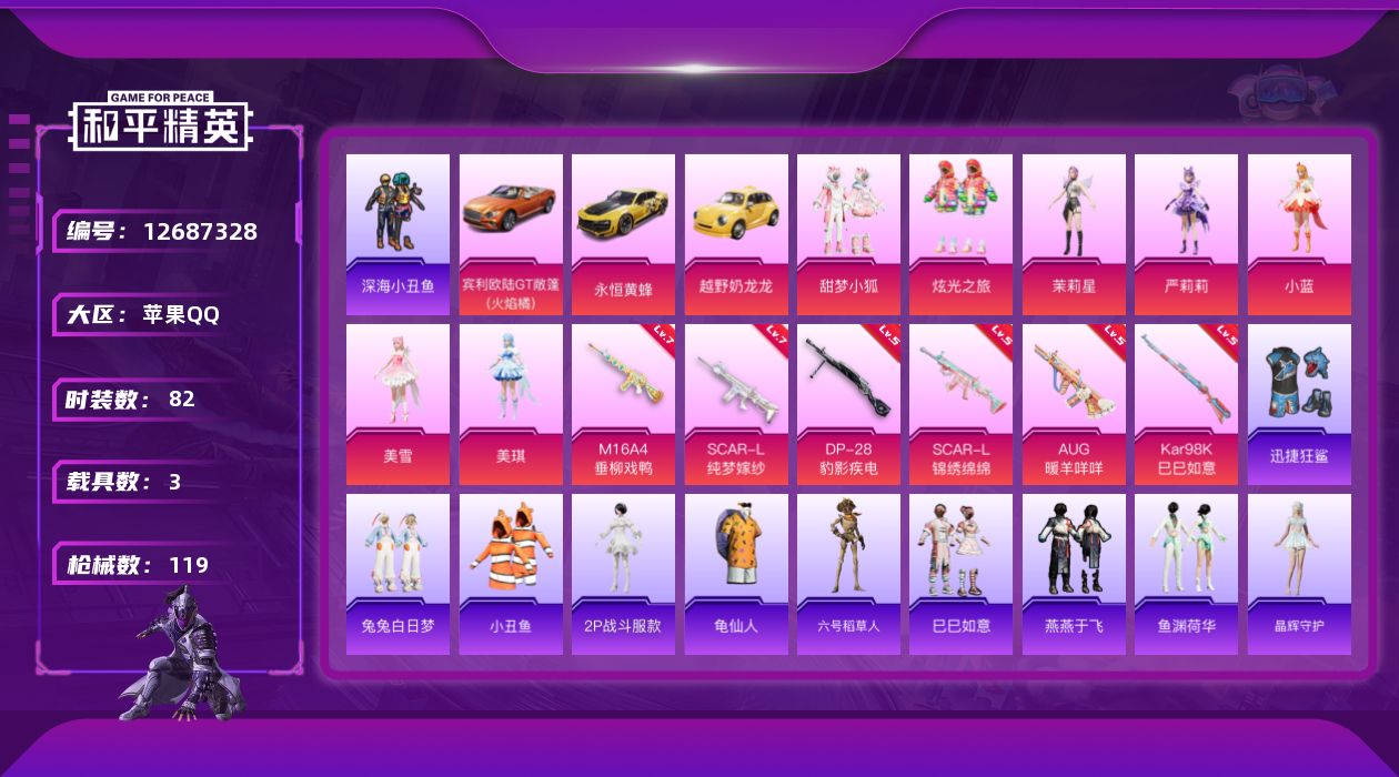 [12687328]【1148】苹果 手Q-7粉装-6特效枪-3载具-1粉色飞行器-42206热力值-12王牌印记-82套装-119枪皮 【热门品类】:套装-深海小丑鱼,套装-小丑鱼,角色-2P战斗服款,套装-龟仙人,角色-六号稻草人 【粉色载具】:宾利欧陆GT敞篷(火焰橘),永恒黄蜂,越野奶龙龙 【粉色套装】:粉装-甜梦小狐,粉装-炫光之旅,角色-茉莉星,角色-严莉莉,角色-小蓝,角色-美雪,角色-美琪 【粉色枪皮等级】:M16A4-垂柳戏鸭(七级),SCAR-L-纯梦嫁纱(七级),SCAR-L-锦绣绵绵(五级),AUG-暖羊咩咩(五级),Kar98K-巳巳如意(五级),DP-28-豹影疾电(五级) 【粉色枪皮】:M16A4-垂柳戏鸭,SCAR-L-纯梦嫁纱,SCAR-L-锦绣绵绵,AUG-暖羊咩咩,Kar98K-巳巳如意,DP-28-豹影疾电 【粉色飞行器】:镜光幻境飞行翼 【粉色降落伞】:童趣迷兔降落伞,天之羽翼降落伞,焦糖拿铁降落伞,恐龙拽拽降落伞,垂柳戏鸭降落伞,彩虹甜喵降落伞,沙丘之主降落伞,巴啦啦小魔仙降落伞,精灵梦叶罗丽降落伞,星穹咏叹调降落伞 【稀有套装】:套装-龟仙人,套装-巳巳如意,套装-燕燕于飞,套装-鱼渊荷华,套装-晶辉守护,套装-粉恋花,套装-紫幽梦,套装-蓝冰羽,角色-六号稻草人,角色-夜瞳黯灵 【稀有枪皮】:AKM-2P战斗服款,AKM-彩虹符号,AKM-龙的传人,SCAR-L-碧影闪光,M416-糯团青竹,GROZA-异彩先驱,AUG-2P战斗服款,QBZ-彩虹符号,QBZ-飞驰魅影,M762-天降萌叽,Mk47-妙红点点,AC-VAL-天降萌叽,AC-VAL-快闪甜心,AC-VAL-六号稻草人,蜜獾-垂柳戏鸭,UZI-啾咪啾咪,UZI-天降萌叽,UMP45-夜灯,UMP45-绒宝小鹅,Vector-焰鹰斗篷,汤姆逊-天降萌叽,汤姆逊-异彩先驱,汤姆逊-炫彩节奏,野牛-沙丘之主,MP5K-异彩先驱,P90-倾城蜜语,P90-快闪甜心,P90-飞驰魅影,P90-巳巳如意,Kar98K-彩虹符号,Kar98K-炫彩节奏,Kar98K-飞驰魅影,AWM-焰鹰斗篷,AWM-垂柳戏鸭,AWM-恐龙拽拽,Mini14-异彩先驱,AMR-妙红点点,M417-惊鸿侠骨,MK20-H-快闪甜心,M200-惊鸿侠骨,M200-六号稻草人,S686-蜜语绒猫,S1897-