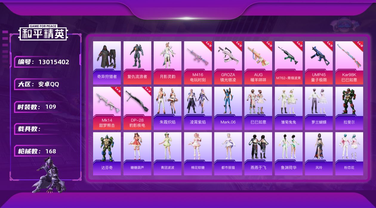 [13015402]【1372】安卓 手Q-2粉装-8特效枪-0载具-1粉色飞行器-48694热力值-6王牌印记-109套装-168枪皮 【热门品类】:套装-奇异狩猎者,角色-Mark.06 【粉色套装】:角色-复仇流浪者,角色-月影灵韵 【粉色枪皮等级】:M416-电玩时刻(五级),GROZA-镜光银凌(五级),AUG-暖羊咩咩(五级),M762-青锋波束(五级),UMP45-量子极限(五级),Kar98K-巳巳如意(五级),Mk14-甜梦熊击(五级),DP-28-豹影疾电(三级) 【粉色枪皮】:M416-电玩时刻,GROZA-镜光银凌,AUG-暖羊咩咩,M762-青锋波束,UMP45-量子极限,Kar98K-巳巳如意,Mk14-甜梦熊击,DP-28-豹影疾电 【粉色降落伞】:星之彼岸降落伞,垂柳戏鸭降落伞,彩虹甜喵降落伞,霓虹漫游降落伞,守护天翼降落伞,金丰海韵降落伞,月影灵韵降落伞,鬼刀降落伞,星穹咏叹调降落伞,时光之吻降落伞 【稀有套装】:套装-巳巳如意,套装-雏菊兔兔,套装-萝兰蝴蝶,角色-拉斐尔,角色-达芬奇,套装-糖糖葫芦,套装-青团波波,套装-棉花软糖,角色-都市丽猫,套装-燕燕于飞,套装-鱼渊荷华,角色-风玲,套装-粉恋花,套装-紫幽梦,套装-蓝冰羽,套装-星影赞美诗,套装-彩虹兔,套装-云朵鹅,套装-雪绒豹,角色-乐音,套装-朱霞炽焰,套装-凌霄紫焰 【稀有枪皮】:AKM-夜灯,AKM-彩虹符号,AKM-生命誓言,AKM-破晓战魂,AKM-萌趣颜团子,AKM-虎虎生威,M16A4-幻世战舞者,M16A4-红色方程式,SCAR-L-炫彩节奏,SCAR-L-玉兔迎春,SCAR-L-红色方程式,SCAR-L-青丘仙客,M416-红色方程式,M416-绯红前夜,M416-蓝色火焰,GROZA-彩虹符号,AUG-甜蜜菠萝,AUG-耀粉歌者,AUG-青春冒险家,QBZ-彩虹符号,M762-天降萌叽,M762-彩虹符号,M762-绯红前夜,M762-云朵鹅,Mk47-青春冒险家,G36C-星穹咏叹调,AC-VAL-天降萌叽,蜜獾-娇憨猪猪,ARX-凌霄紫焰,UZI-天降萌叽,UZI-娇憨猪猪,UZI-炫彩节奏,UZI-红色方程式,UMP45-生命誓言,UMP45-蓝色火焰,Vector-彩虹符号,Vector-生命誓言,汤姆逊-奇异狩猎者,汤姆逊-环太平洋,野牛-青春冒险家,J