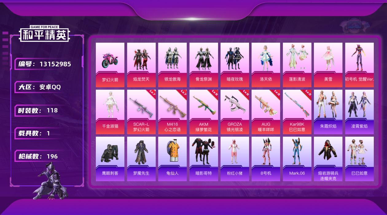 [13152985]【1412】安卓 手Q-9粉装-6特效枪-1载具-2粉色飞行器-58323热力值-12王牌印记-118套装-196枪皮 【热门品类】:套装-龟仙人,套装-暗影哥特,套装-粉红小猪,角色-8号机,角色-Mark.06,熔岩游骑兵面罩,大砍刀-青龙偃月刀,熔岩游骑兵连帽夹克 【粉色载具】:双人摩托-梦幻火箭 【粉色套装】:粉装-焰龙焚天,粉装-银龙傲海,粉装-骨龙祭渊,粉装-暗夜玫瑰,角色-洛天依,粉装-莲影清波,角色-美雪,角色-初号机 觉醒Ver.,角色-千金淑猫 【粉色枪皮等级】:AKM-绿萝繁花(五级),SCAR-L-梦幻火箭(七级),M416-心之恋语(七级),GROZA-镜光银凌(五级),AUG-暖羊咩咩(五级),Kar98K-巳巳如意(五级) 【粉色枪皮】:AKM-绿萝繁花,SCAR-L-梦幻火箭,M416-心之恋语,GROZA-镜光银凌,AUG-暖羊咩咩,Kar98K-巳巳如意 【粉色飞行器】:梦幻火箭飞行器,黄族统领飞行器 【粉色降落伞】:梦幻火箭降落伞,洛神天依降落伞,暗夜鎏金降落伞,飒粉甜心降落伞,绝色倾城降落伞,江南烟雨降落伞,巴啦啦小魔仙降落伞,临安公主降落伞,月影灵韵降落伞 【稀有套装】:套装-龟仙人,套装-巳巳如意,套装-雏菊兔兔,套装-萝兰蝴蝶,套装-小熊娃娃,套装-糖糖葫芦,套装-青团波波,套装-棉花软糖,角色-都市丽猫,套装-燕燕于飞,套装-鱼渊荷华,套装-粉恋花,套装-紫幽梦,套装-蓝冰羽,套装-星影赞美诗,套装-星渊小夜曲,套装-虚空漩涡,套装-极速光影,套装-彩虹兔,套装-云朵鹅,套装-雪绒豹,套装-朱霞炽焰,套装-凌霄紫焰 【稀有枪皮】:AKM-缤纷海域,AKM-虎虎生威,AKM-锦绣火鲤,AKM-龙的传人,SCAR-L-炫彩节奏,M416-彩虹嘻嘻猴,M416-糯团青竹,GROZA-影袭,GROZA-懵萌河马,GROZA-荧海星豚,AUG-天降萌叽,AUG-焰龙焚天,AUG-耀粉歌者,QBZ-原初圣火,QBZ-彩虹符号,QBZ-未来歌姬,QBZ-潮汐统领,M762-奇异狩猎者,M762-彩虹符号,M762-牛气冲天,M762-瑞龙福将,M762-镭射皇者,M762-云朵鹅,Mk47-妙红点点,Mk47-湮灭星辰,G36C-懵萌河马,G36C-星穹咏叹调,AC-VAL-快闪甜心,蜜獾-天降萌叽,Famas-墨龙九天,ARX-