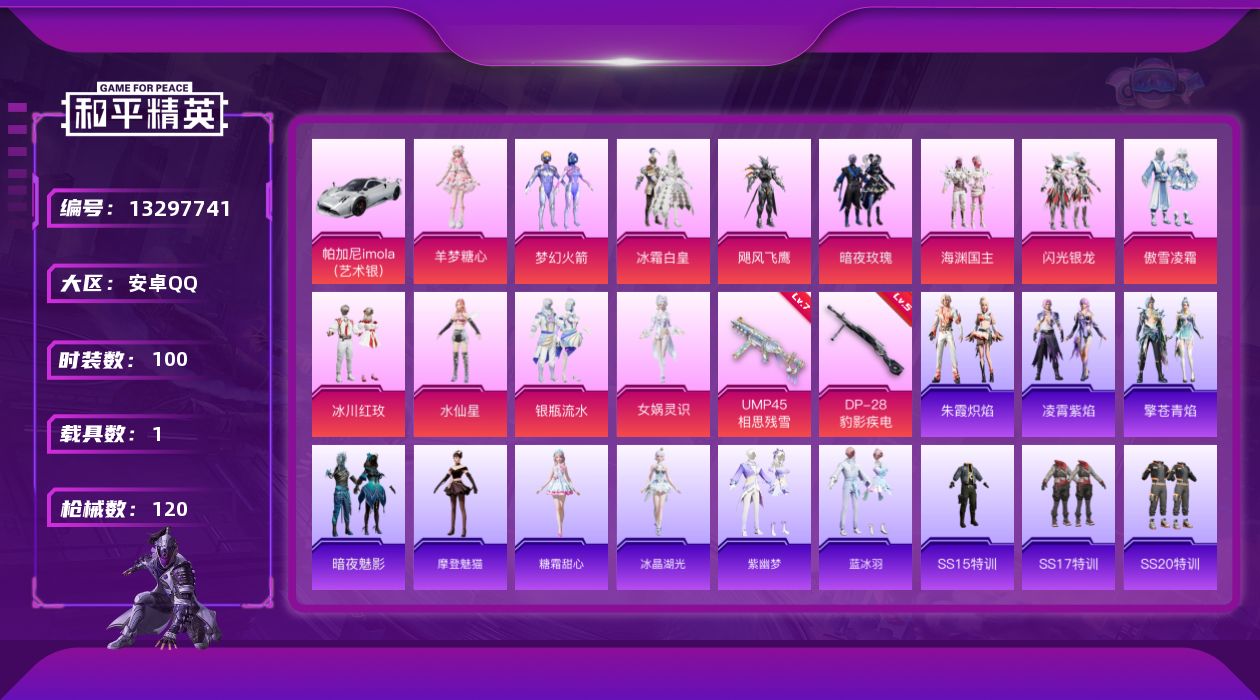 [13297741]【1425】安卓 手Q-12粉装-2特效枪-1载具-2粉色飞行器-40393热力值-2王牌印记-100套装-120枪皮
