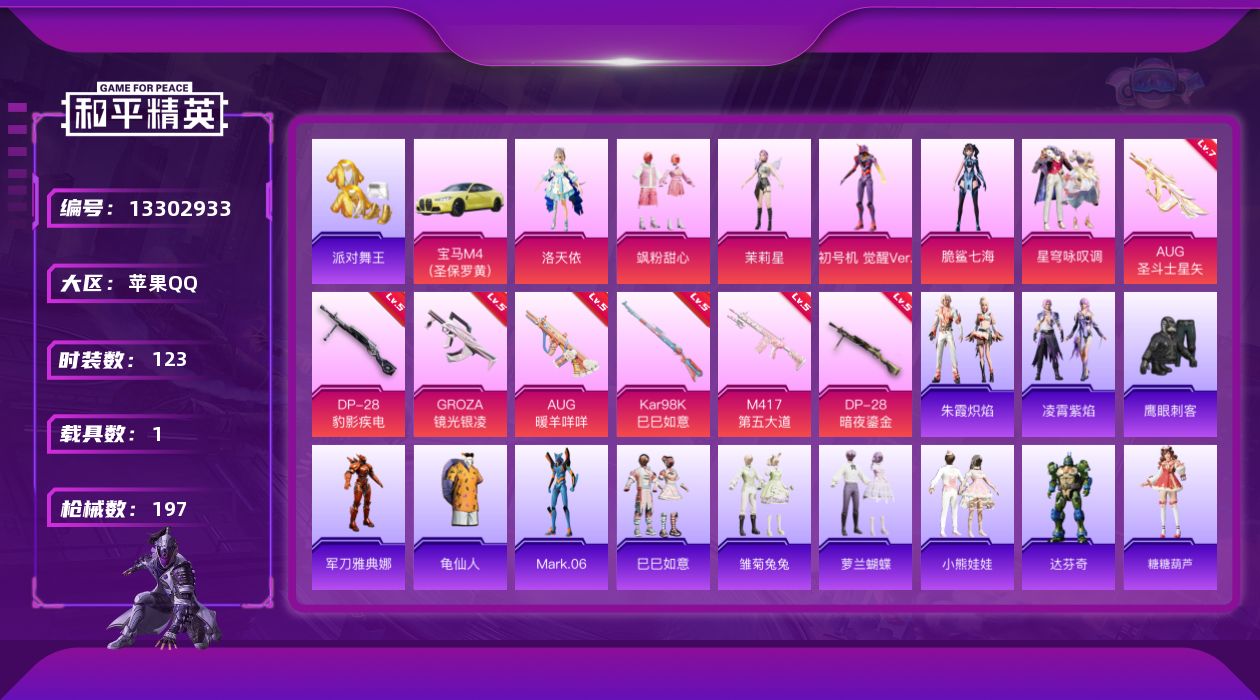 [13302933]【1435】苹果 手Q-6粉装-7特效枪-1载具-1粉色飞行器-58772热力值-12王牌印记-123套装-197枪皮