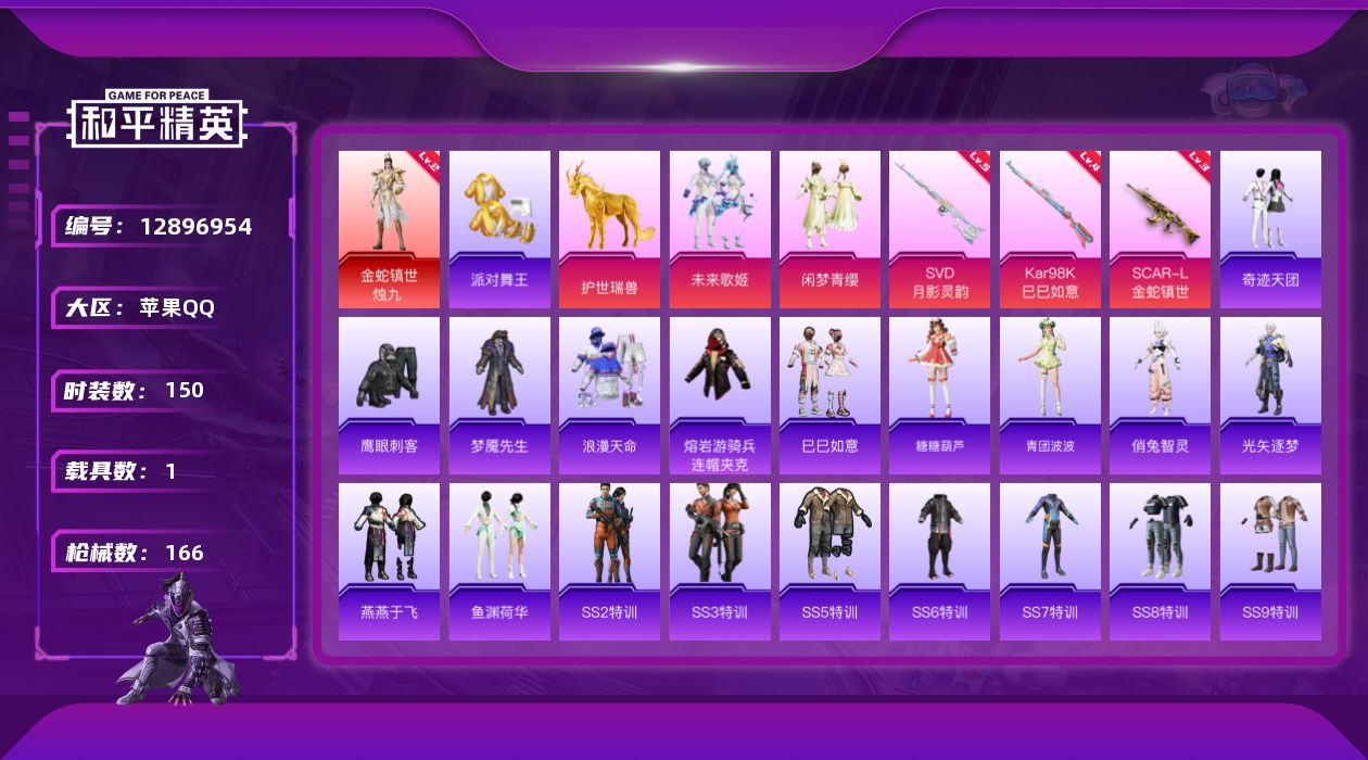 [12896954]【1438】苹果 手Q-1神装-2粉装-3特效枪-1载具-3粉色飞行器-50055热力值-7王牌印记-150套装-166枪皮