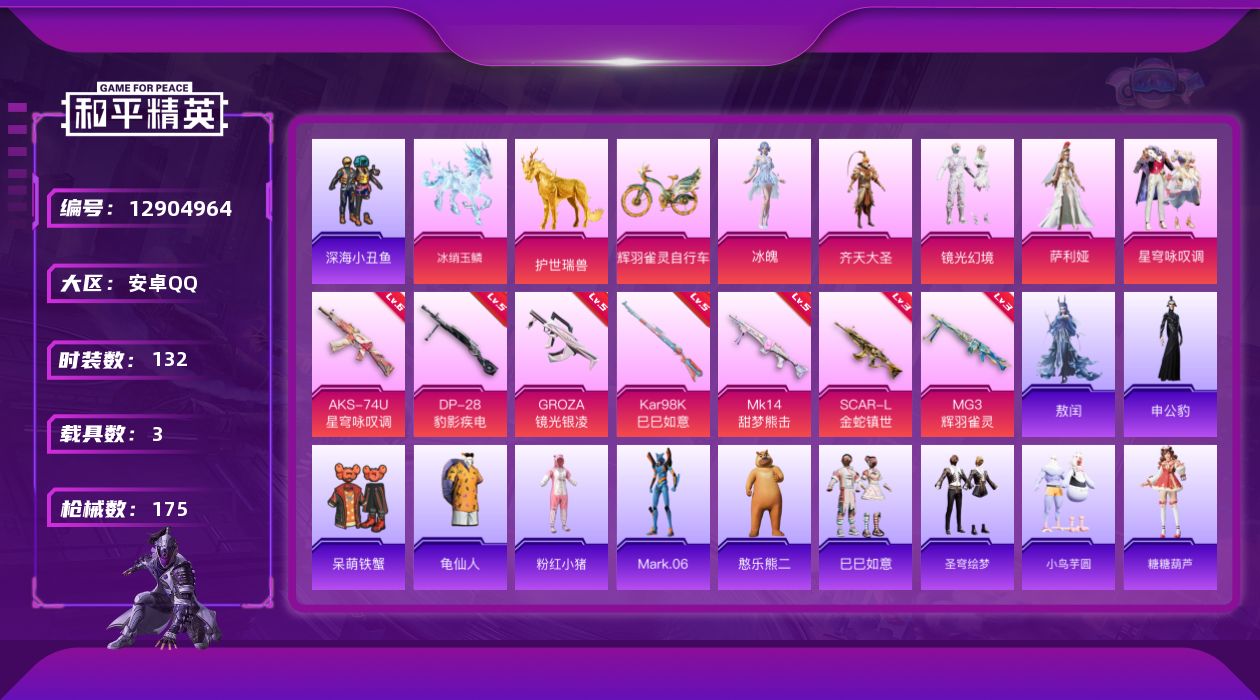 [12904964]【1454】安卓 手Q-5粉装-7特效枪-3载具-7粉色飞行器-56966热力值-16王牌印记-132套装-175枪皮 【热门品类】:套装-深海小丑鱼,套装-龟仙人,套装-粉红小猪,角色-Mark.06 【粉色载具】:护世瑞兽,冰绡玉鳞,辉羽雀灵自行车 【粉色套装】:粉装-齐天大圣,粉装-镜光幻境,角色-萨利娅,粉装-星穹咏叹调,角色-冰魄 【粉色枪皮等级】:SCAR-L-金蛇镇世(三级),GROZA-镜光银凌(五级),AKS-74U-星穹咏叹调(六级),Kar98K-巳巳如意(五级),Mk14-甜梦熊击(五级),DP-28-豹影疾电(五级),MG3-辉羽雀灵(三级) 【粉色枪皮】:SCAR-L-金蛇镇世,GROZA-镜光银凌,AKS-74U-星穹咏叹调,Kar98K-巳巳如意,Mk14-甜梦熊击,DP-28-豹影疾电,MG3-辉羽雀灵 【粉色飞行器】:齐天大圣飞行器,千面幻镜飞行器,镜光幻境飞行翼,万象金身飞行器,百变魔方飞行器,雀灵庇佑飞行器 【粉色降落伞】:暗夜玫瑰降落伞,千面幻镜降落伞,萌物绒绒降落伞,繁龙极客降落伞,霓虹漫游降落伞,创世·救赎降落伞,临安公主降落伞,金蛇镇世降落伞,幻影飞狐降落伞,雪月幻音降落伞,星穹咏叹调降落伞,辉羽雀灵降落伞,幻彩电音降落伞 【稀有套装】:套装-龟仙人,玩偶服-憨乐熊二,套装-巳巳如意,套装-圣穹绘梦,套装-小鸟芋圆,套装-糖糖葫芦,套装-青团波波,套装-棉花软糖,角色-临安公主,角色-怀庆长公主,套装-燕燕于飞,套装-鱼渊荷华,套装-旋风灵鼠,套装-粉恋花,套装-紫幽梦,套装-蓝冰羽,套装-星影赞美诗,套装-星渊小夜曲,套装-极速光影,套装-彩虹兔,套装-云朵鹅,套装-雪绒豹,套装-蜜露汐语,角色-敖闰,角色-申公豹 【稀有枪皮】:AKM-彩虹符号,AKM-生命誓言,AKM-破晓战魂,AKM-虎虎生威,AKM-龙的传人,M16A4-幻世战舞者,M16A4-红色方程式,M16A4-蓝色火焰,SCAR-L-玉兔迎春,SCAR-L-红色方程式,M416-糯团青竹,M416-红色方程式,M416-蓝色火焰,GROZA-田园牧歌,AUG-海螺星光,AUG-耀粉歌者,AUG-金蛇镇世,M762-天降萌叽,M762-彩虹符号,M762-萌物绒绒,M762-云朵鹅,Mk47-妙红点点,Mk47-洛神天依,G36C-星穹咏叹调,AC-