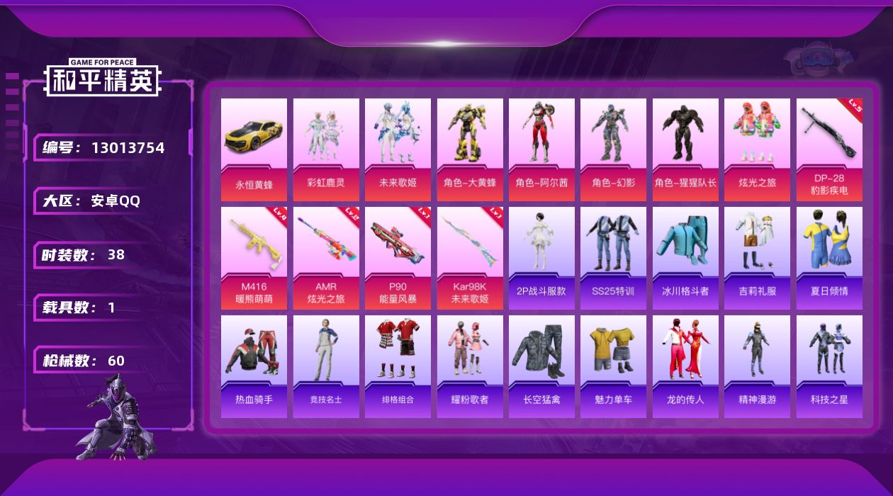 [13013754]【1478】安卓 手Q-7粉装-5特效枪-1载具-2粉色飞行器-21706热力值-1王牌印记-38套装-60枪皮 【热门品类】:角色-2P战斗服款 【粉色载具】:永恒黄蜂 【粉色套装】:粉装-彩虹鹿灵,粉装-未来歌姬,角色-大黄蜂,角色-阿尔茜,角色-幻影,角色-猩猩队长,粉装-炫光之旅 【粉色枪皮等级】:M416-暖熊萌萌(四级),P90-能量风暴(一级),Kar98K-未来歌姬(一级),AMR-炫光之旅(二级),DP-28-豹影疾电(五级) 【粉色枪皮】:M416-暖熊萌萌,P90-能量风暴,Kar98K-未来歌姬,AMR-炫光之旅,DP-28-豹影疾电 【粉色飞行器】:梦幻火箭飞行器,变形金刚飞行器 【粉色降落伞】:恐龙拽拽降落伞,暖熊萌萌降落伞,炎氏战神降落伞,未来歌姬降落伞,炫光之旅降落伞 【稀有枪皮】:AKM-2P战斗服款,AKM-龙的传人,M16A4-幻世战舞者,SCAR-L-甜蜜旋律,M416-红色方程式,GROZA-2B战斗服款,GROZA-恐龙拽拽,AUG-2P战斗服款,AUG-冰川粉黛,AUG-耀粉歌者,QBZ-未来歌姬,M762-暖熊萌萌,M762-能量风暴,Mk47-炫光之旅,蜜獾-天降萌叽,UZI-啾咪啾咪,UMP45-时空追击者,UMP45-炫光之旅,Vector-治愈之星,Vector-风花雪月,汤姆逊-天降萌叽,汤姆逊-林间仙鹿,汤姆逊-耀粉歌者,P90-飞驰魅影,Kar98K-2B战斗服款,Kar98K-炫彩节奏,Kar98K-飞驰魅影,SKS-心之恋语,SKS-未来歌姬,SKS-炫彩节奏,SKS-糯团青竹,Mini14-梦幻火箭,Mk14-童趣迷兔,M417-惊鸿侠骨,M200-惊鸿侠骨,S1897-飞驰魅影,S12K-玩趣呆呆,S12K-暖熊萌萌,AA12-G-炫光之旅,DP-28-甜蜜旋律,MG3-惊鸿侠骨,TMP-9-未来歌姬,爆炸猎弓-惊鸿侠骨,大砍刀-2P战斗服款 【其他套装】:套装-NV战队服,套装-SS25特训,套装-冰川格斗者,套装-吉莉礼服,套装-夏日倾情,套装-热血骑手,套装-竞技名士,套装-绯格组合,套装-耀粉歌者,套装-长空猛禽,套装-魅力单车,套装-龙的传人,套装-精神漫游,套装-科技之星,套装-梦起落英,套装-音速流光,套装-粉团憨憨,套装-软羊咩咩,套装-香榭午后,套装-绝对偶像,套装-元气发射,
