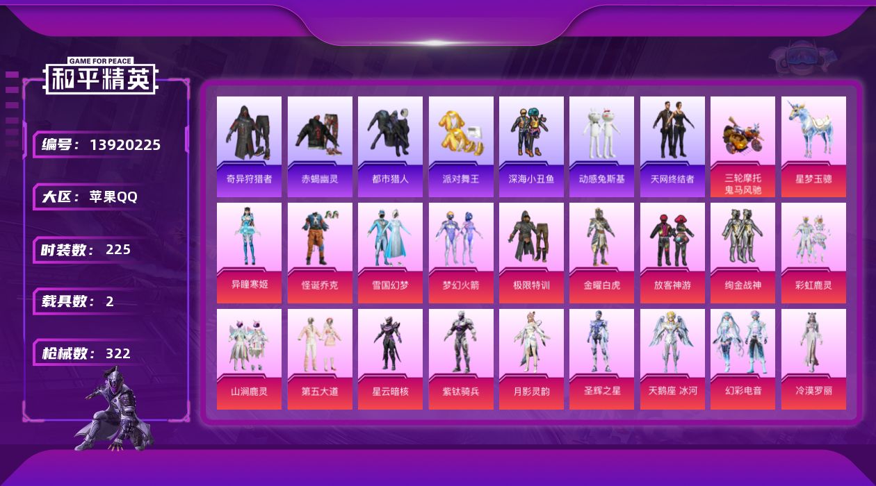 [13920225]【1563】苹果 手Q-18粉装-15特效枪-2载具-9粉色飞行器-106558热力值-14王牌印记-225套装-322枪皮