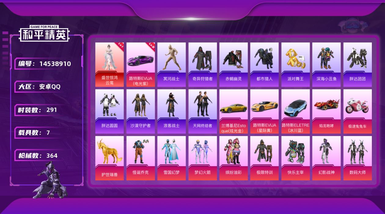 [14538910]【1622】安卓 手Q-无敌战神框-1神装-44粉装-16特效枪-7载具-15粉色飞行器-160028热力值-17王牌印记-291套装-364枪皮 【红色载具】:路特斯EVIJA(电光紫)(六级) 【红色神装等级】:盛世惊鸿-云鸾(一级) 【红色角色神装】:盛世惊鸿-云鸾 【热门品类】:粉装-怪诞乔克,粉装-雪国幻梦,粉装-梦幻火箭,粉装-缤纷油彩,套装-浪漫天命,套装-赤蝎幽灵,套装-都市猎人,套装-冥河战士,套装-派对舞王,套装-深海小丑鱼,套装-小丑鱼,套装-奇异狩猎者,角色-军刀雅典娜,套装-胖达团团,套装-胖达圆圆,套装-天网终结者,套装-金羽特工,套装-沙漠守护者,套装-忍者信条,套装-浪客战士,角色-2B战斗服款,套装-龟仙人,套装-潮萌小黄鸭,套装-暗影哥特,M416-星际漫游 【粉色载具】:兰博基尼Estoque(炫光金),路特斯EVIJA(电光紫),路特斯EVIJA(星际黄),路特斯ELETRE(冰川蓝),焰龙咆哮,极速兔兔车,僚机-萌兔起飞,护世瑞兽 【粉色套装】:粉装-极限特训,粉装-快乐主宰,粉装-幻影战神,粉装-数码大师,粉装-怪诞乔克,粉装-甜心巧克力,粉装-宝贝奶油派,粉装-天使彩虹糖,粉装-雪国幻梦,粉装-蝶舞迷情,粉装-梦幻火箭,粉装-星之信仰,粉装-金属狂野,粉装-缤纷油彩,粉装-放客神游,粉装-新星烈龙,粉装-极致幻想,粉装-花间之火,粉装-诡面斩,粉装-绚金战神,粉装-冰霜白皇,粉装-炙焰红王,角色-初号机款机体服,粉装-海盐物语,粉装-恐龙拽拽,粉装-冷魅冰骑,粉装-赤焰黑爵,粉装-紫电风暴,粉装-炙焰牛王,粉装-妙趣可丽,粉装-闪光银龙,粉装-暖熊萌萌,粉装-灵感创作师,粉装-千面幻镜,粉装-霞光圣骑,粉装-寒光使者,粉装-雪梅暗香,角色-白勺歌姬,角色-呆萌星弥,角色-小可学妹,粉装-霓虹漫游,角色-千金淑猫,角色-智耀战神,角色-绯穹魔姬 【粉色枪皮等级】:AKM-甜心宝贝(七级),SCAR-L-梦幻火箭(七级),M416-五爪金龙(五级),M416-心之恋语(一级),M416-暖熊萌萌(一级),M416-超新星(九级),GROZA-香水柠檬(五级),AUG-妙趣可丽(六级),UMP45-雪国精灵(五级),Vector-最终圣卫者(三级),Kar98K-圣光天使(五级),Kar98K-巳巳如意(五级),M24-暗星