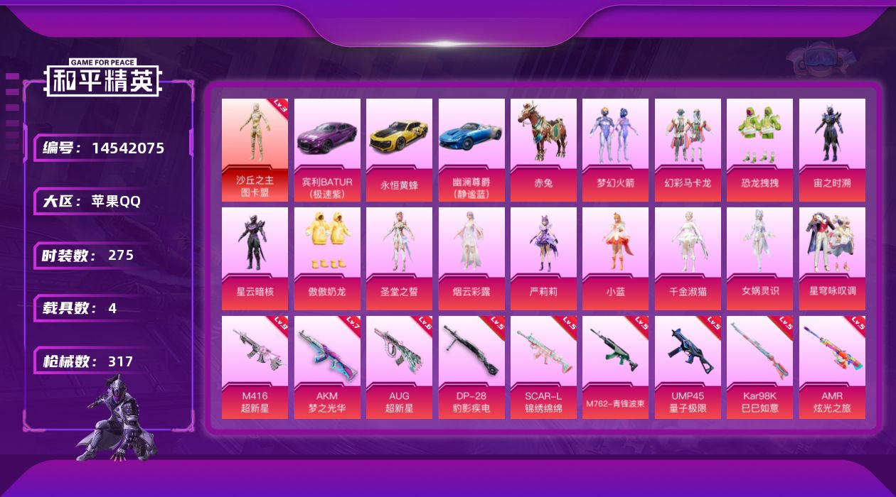 [14542075]【1630】苹果 手Q-1神装-13粉装-16特效枪-4载具-15粉色飞行器-120687热力值-21王牌印记-275套装-317枪皮 【红色神装等级】:沙丘之主-图卡盟(三级) 【红色角色神装】:沙丘之主-图卡盟 【热门品类】:粉装-梦幻火箭,套装-浪漫天命,套装-小丑鱼,角色-忠猛周仓,角色-忠真马岱,套装-龟仙人,套装-粉红小猪,角色-8号机,角色-Mark.06,角色-六号稻草人,大砍刀-青龙偃月刀,撬棍-龙胆亮银枪 【粉色载具】:宾利BATUR(极速紫),永恒黄蜂,幽澜尊爵(静谧蓝),赤兔 【粉色套装】:粉装-梦幻火箭,粉装-幻彩马卡龙,粉装-恐龙拽拽,角色-宙之时溯,角色-星云暗核,粉装-傲傲奶龙,角色-圣堂之誓,角色-烟云彩露,角色-严莉莉,角色-小蓝,角色-千金淑猫,角色-女娲灵识,粉装-星穹咏叹调 【粉色枪皮等级】:AKM-梦之光华(七级),SCAR-L-锦绣绵绵(五级),M416-风花雪月(一级),M416-超新星(九级),GROZA-精灵之光(三级),AUG-超新星(六级),M762-青锋波束(五级),UMP45-量子极限(五级),P90-沙丘之主(三级),Kar98K-巳巳如意(五级),M24-镜域双华(三级),Mk14-盛世惊鸿(三级),AMR-炫光之旅(五级),MK12-雪月幻音(三级),DP-28-豹影疾电(五级) 【粉色枪皮】:AKM-梦之光华,SCAR-L-锦绣绵绵,M416-风花雪月,M416-超新星,GROZA-精灵之光,AUG-超新星,M762-青锋波束,UMP45-量子极限,P90-沙丘之主,Kar98K-巳巳如意,M24-镜域双华,Mk14-盛世惊鸿,AMR-炫光之旅,MK12-雪月幻音,DP-28-豹影疾电,破片手榴弹-秋玉花灯 【粉色飞行器】:酣梦熊熊飞行器,萌物绒绒飞行器,超新星飞行器,万古烈焰飞行器,沙丘之主天马,镜域双华-灵镜之阶,绝色倾城飞行器,龙翔九天飞行器,深渊漩涡飞行器,幽焰列车飞行器,脆鲨七海飞行器,凤舞九天飞行器,赛博古神飞行器,极意拳锋飞行器 【粉色降落伞】:至尊龙雀降落伞,精灵迷巫降落伞,梦幻火箭降落伞,古堡领主降落伞,甜蜜誓约降落伞,星之彼岸降落伞,甜梦小狐降落伞,暗夜鎏金降落伞,第五大道降落伞,萌物绒绒降落伞,炫光之旅降落伞,莲影清波降落伞,圣堂之誓降落伞,沙丘之主降落伞,蜜语绒猫降落伞,镜