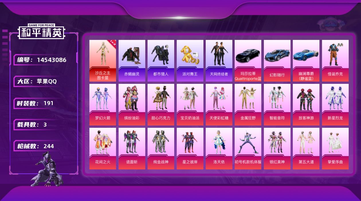 - [12235506]6粉装 4特效枪 6印记 可二次 可修改实名 优质装备:古堡领主,未来战士,M416风花雪月,Kar98K-巳巳如意 热门装扮:花影阑珊,齐天大圣,银龙傲海,暗夜玫瑰,软萌银虎,奇迹天团,潮萌小黄鸭,恒星战甲,万圣娃娃,梦魇先生,好奇恐龙,黄金大亨,花面小丑,暗夜魅影 稀有枪皮:MG-36-沧焰双生,DP-28-豹影疾电 五级特效枪:五级Kar98K-巳巳如意,五级DP-28-豹影疾电,五级MG-36-沧焰双生 一级特效枪:一级M416-风花雪月 紫色装扮:云朵鹅,彩虹兔,雪绒豹,SS33特训套装,青涩时光,旭日情侣,顶瓜瓜,北国孤狼,千禧之恋,午夜朋克,和平特警,圣诞大吉,坚韧舞者,夜莺强袭者,刚毅裁决者,完美偶像,帅气教官,幻世战舞者,幻影武者,怒火燎原,战地督导,凛冬战士,SS4特训,SS2特训,SS3特训,SS5特训,冷焰舞者,伏击者,六六大吉,冰川特警,闪银刀客,SS16特训,真理款战斗服,天籁歌者,瑞龙福将,团圆交子,醒狮腾龙,SS17特训,科技之星,SS14特训,萌趣颜团子,特种颜团子,SS15特训,覆海蛟龙,SS20特训,战地菁英,糖果砰砰,异彩先驱,SS18特训,SS19特训,骑行爱好者,魅力单车,黄色伏地魔,黄色名流,黄色格斗者,黄色运动,黎明保卫者,黑色伏地魔,龙腾端午,风暴特警,风行保卫者,金鼠迎春,迎春赐吉,都市魅力,酒红色名流,酷潮明星,野性战魂,长空猛禽,阳光火鸡,雪山征服者,雪山精英,雷霆特警,霓虹极客,霓虹街区,绛羽幽主,滨海假日,滨海厨神,潮流先锋,灰色格斗者,灼焰舞者,熔岩使者,燃烧卡路里,牛气冲天,牛气满满,特战装甲,特殊使命,深蓝色名流,格斗先锋,攀登者,浪漫樱花,极地朋克,极速红龙,沙漠兵团,派对绅士,海岛探路者,特训学院,跃动心情,绮丽涂鸦,缤纷果语,蓝彩潮人,蓝色守护者,蓝色运动,虎虎生威吉莉,街头潮人,白色伏地魔,猛禽,甜蜜告白,甜蜜熊情侣,甜蜜菠萝,疯狂小兔子,破晓战魂,破蛋小黄鸡,神秘领域,福星高照,空投萌叽,竞技勇士朋克,竞技达人朋克,治愈之星,迷雾之月,晶辉守护,竞技名士,冰公主,浪漫天命,精神漫游,核芯基因,SS7特训,人鱼之吻,SS8特训,顽皮玉兔,SS9特训,舞夜骑士,黑色刀锋,精密机核,幻世尖兵,火舞潮人,太极红客,玲珑飞花,淡雅花蕊,拳皇97八神庵,炽焰拳师,格斗专家,SS6特训,SS10特训,SS