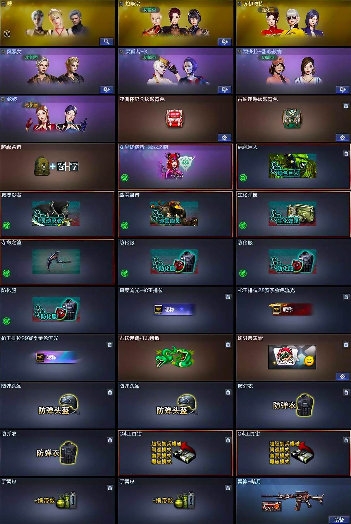【道具】:亚洲杯纪念炫彩背包,古蛇迷踪炫彩背包,超级背包,女皇终结者-魔龙之吻,绿色巨人,灵魂忍者,迷雾幽灵,生化弹匣,夺命之镰,防化服*3,星辰流光-枪王排位,枪王排位28赛季金色流光,枪王排位29赛季金色流光,古蛇迷踪打击特效,蛇隐宗表情,防弹头盔*2,防弹衣*2,C4工具钳*2,手雷包*2