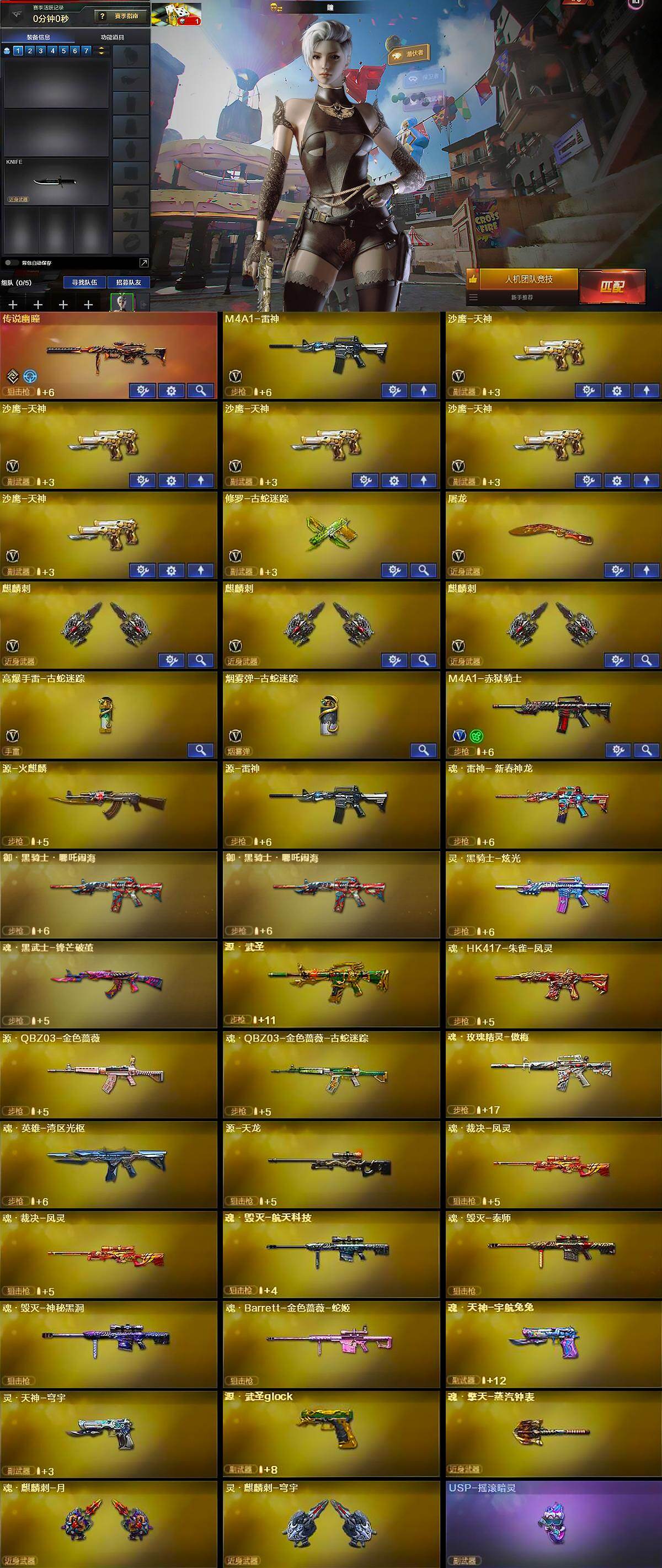 【英雄级武器】:M4A1-雷神,沙鹰-天神*5,修罗-古蛇迷踪,屠龙,麒麟刺*3,高爆手雷-古蛇迷踪,烟雾弹-古蛇迷踪,M4A1-赤狱骑士