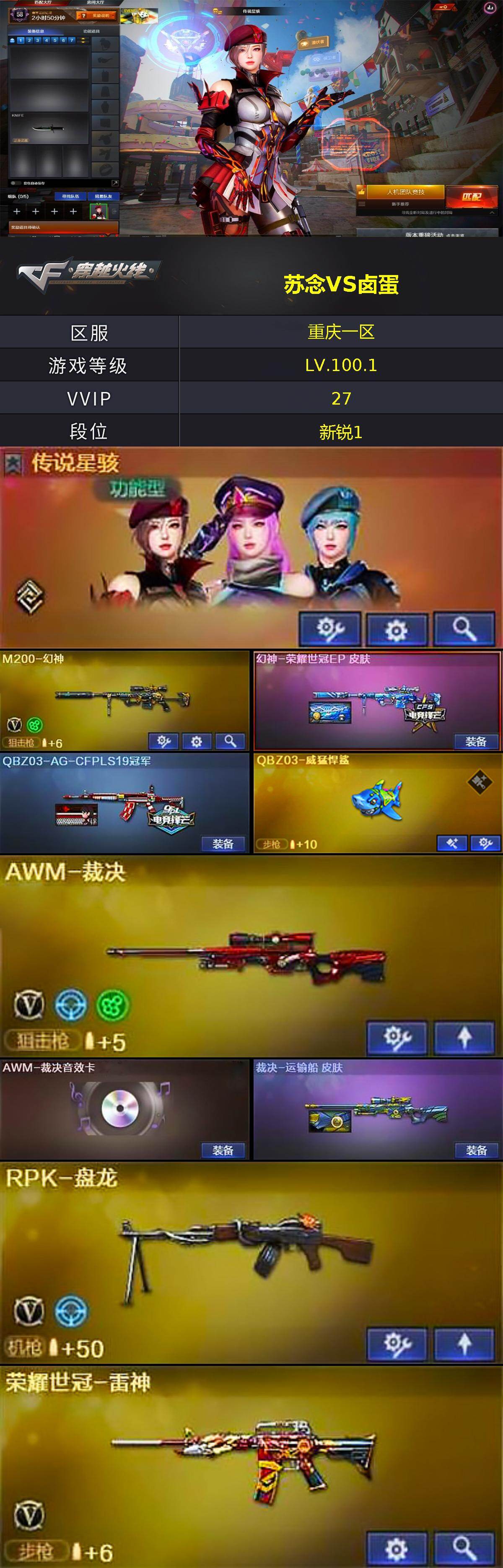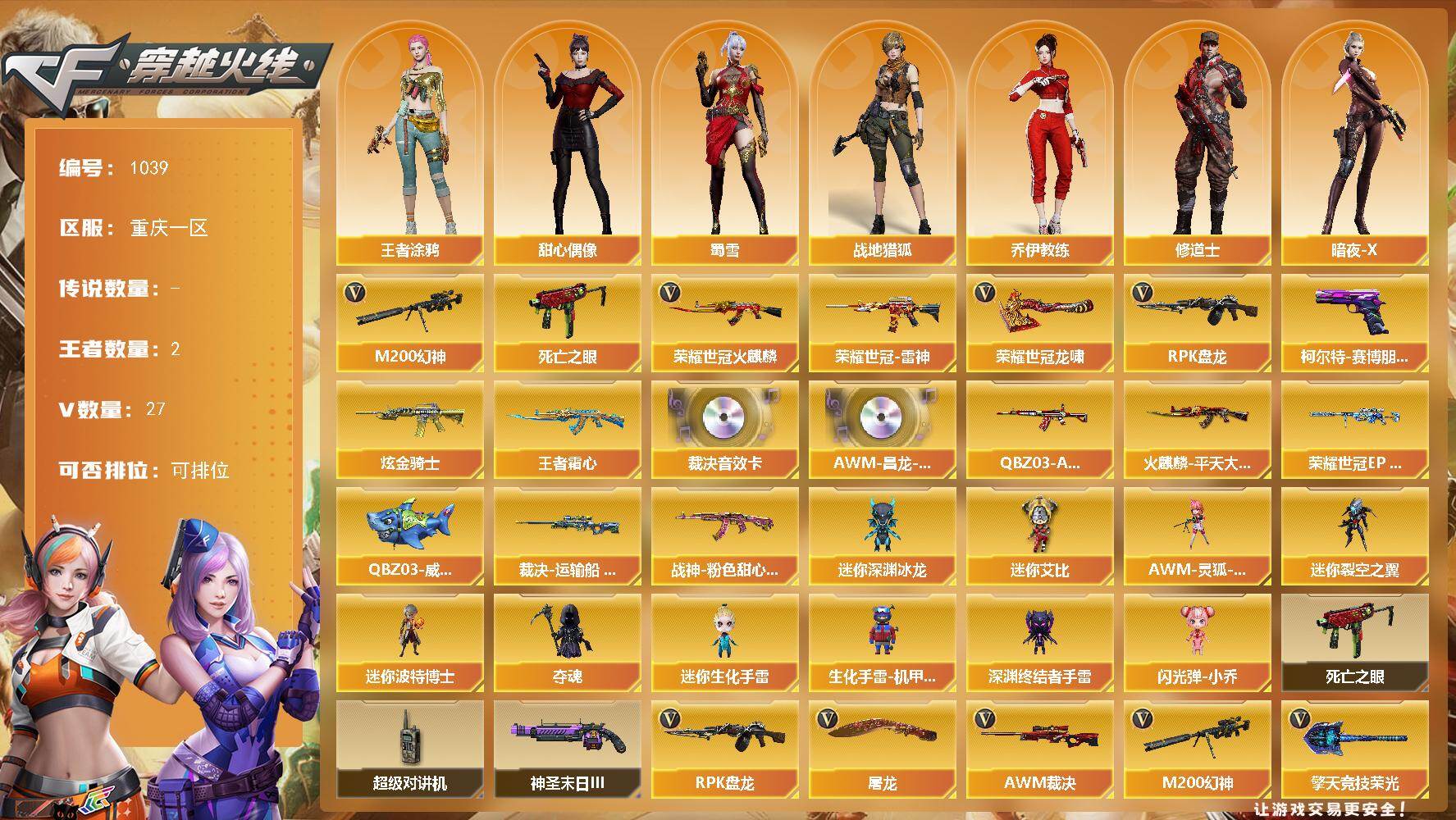 [16137120]重庆一区-27V-2王者-1炫金 【传说角色】:传说星骇 【热门武器】:M200-幻神,死亡之眼,荣耀世冠-火麒麟,荣耀世冠-雷神,RPK-盘龙,柯尔特-赛博朋克,荣耀世冠-龙啸 【王者炫金武器】:王者霜心,炫金骑士 【音效卡】:AWM-裁决音效卡,AWM-昌龙-怀旧音效卡 【皮肤】:幻神-荣耀世冠EP 皮肤,QBZ03-AG-CFPLS19冠军,QBZ03-威猛悍鲨,裁决-运输船 皮肤,火麒麟-平天大圣,战神-粉色甜心皮肤 【角色】:妮妮,战地猎狐,王者涂鸦,乔伊教练,修道士,暗夜-X,北极狐-X,初恋灵狐,风暴女,虎妞,嘉年华灵狐,疾风,兰妹妹,灵狐者-X,灵狐者-七夕宝贝,龙儿-小淘气,麻雀,潘多拉-X,潘多拉-甜心教官,潜龙队-X,斯沃特-X,甜心偶像,蜀雪,兔囡囡,维纳斯,新娜塔莎 【人偶武器】:AWM-灵狐-15周年嘉年华,迷你深渊冰龙,迷你裂空之翼*2,迷你波特博士,夺魂,迷你生化手雷,生化手雷-机甲核心,深渊终结者手雷*2,闪光弹-小乔,迷你艾比 【暴走生化】:死亡之眼,超级对讲机 【挑战大师】:神圣爆裂者-末日III 【英雄级武器】:无影-神兵利器,黑武士-锦绣游龙,烈火-动感闪耀,AK47-B-战神,荣耀世冠-火麒麟,荣耀世冠-雷神,AWM-裁决,M200-幻神,王者之怒-觉醒版,RPK-盘龙,天神-动感闪耀,屠龙,擎天-竞技荣光,屠龙-动感闪耀,荣耀世冠-龙啸,手雷-动感闪耀,高爆手雷-玄豹,闪光弹-玄豹,烟雾弹-雷暴,烟雾弹-竞技荣光,烟雾弹-玄豹,M4A1-赤狱骑士,AWM-昌龙 【道具】:EP战队炫彩背包,云山科技背包,战舰背包,超级背包,女皇终结者-魔龙之吻,救世主-黑桃战神,绿色巨人,灵魂忍者,变异宝贝,迷雾幽灵,夺命之镰,防化服*3,金色流光-枪王排位*2,流光-再燃火线,枪王排位28赛季金色流光,语音特效-怀旧,电玩兔兔表情,动感闪耀表情,EP战队收纳包,EP战队名片,EP战队击杀图标,防弹头盔*5,防弹衣*5,C4工具钳*6,手雷包*6 【特殊枪械】:1盘龙