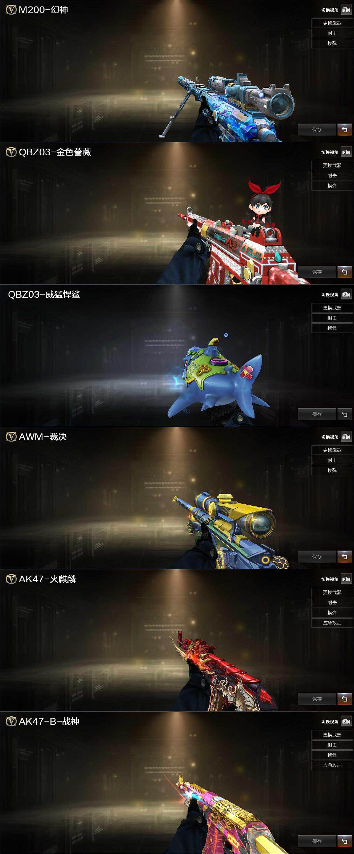 【英雄级武器】:无影-神兵利器,黑武士-锦绣游龙,烈火-动感闪耀,AK47-B-战神,荣耀世冠-火麒麟,荣耀世冠-雷神,AWM-裁决,M200-幻神,王者之怒-觉醒版,RPK-盘龙,天神-动感闪耀,屠龙,擎天-竞技荣光,屠龙-动感闪耀,荣耀世冠-龙啸,手雷-动感闪耀,高爆手雷-玄豹,闪光弹-玄豹,烟雾弹-雷暴,烟雾弹-竞技荣光,烟雾弹-玄豹,M4A1-赤狱骑士,AWM-昌龙