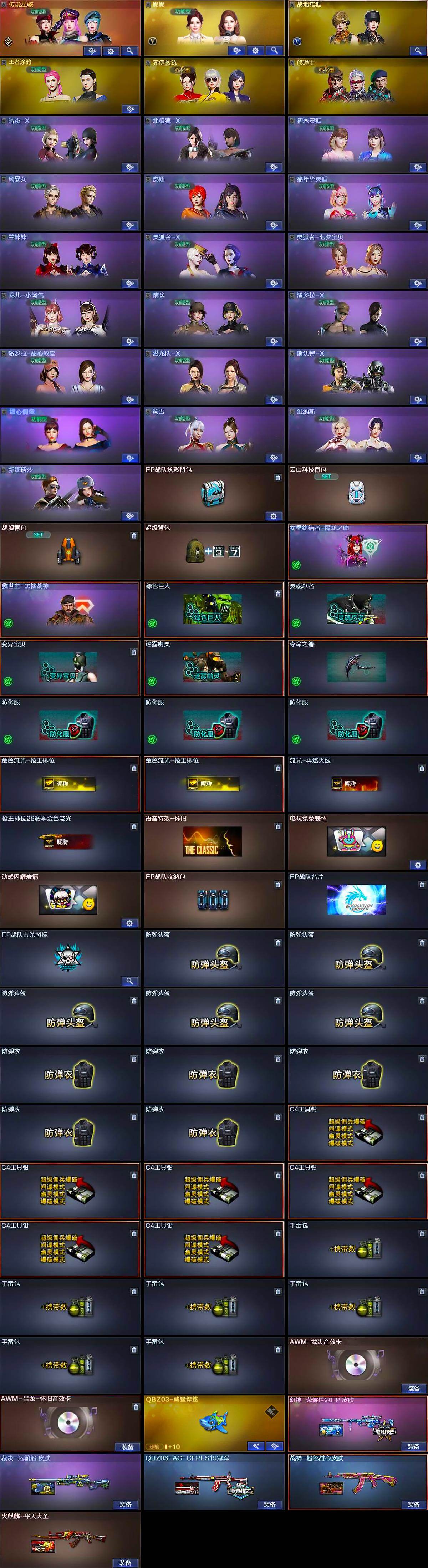 【道具】:EP战队炫彩背包,云山科技背包,战舰背包,超级背包,女皇终结者-魔龙之吻,救世主-黑桃战神,绿色巨人,灵魂忍者,变异宝贝,迷雾幽灵,夺命之镰,防化服*3,金色流光-枪王排位*2,流光-再燃火线,枪王排位28赛季金色流光,语音特效-怀旧,电玩兔兔表情,动感闪耀表情,EP战队收纳包,EP战队名片,EP战队击杀图标,防弹头盔*5,防弹衣*5,C4工具钳*6,手雷包*6